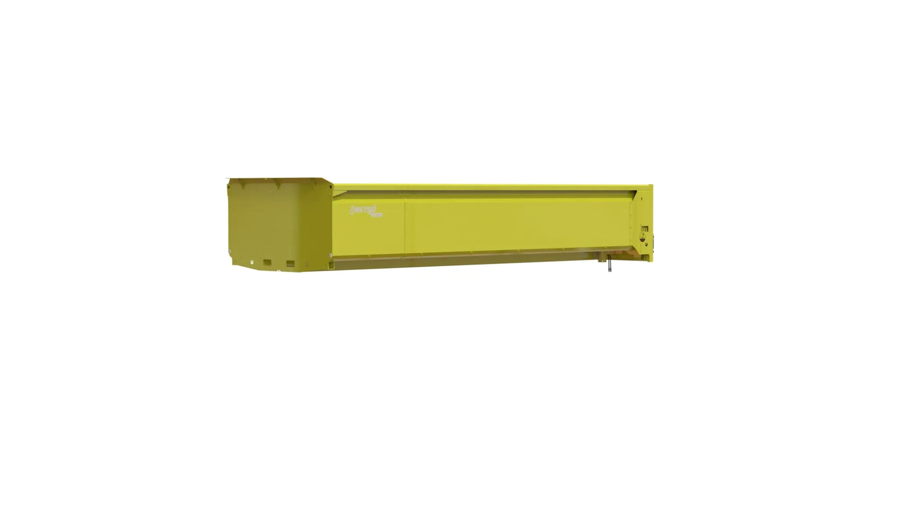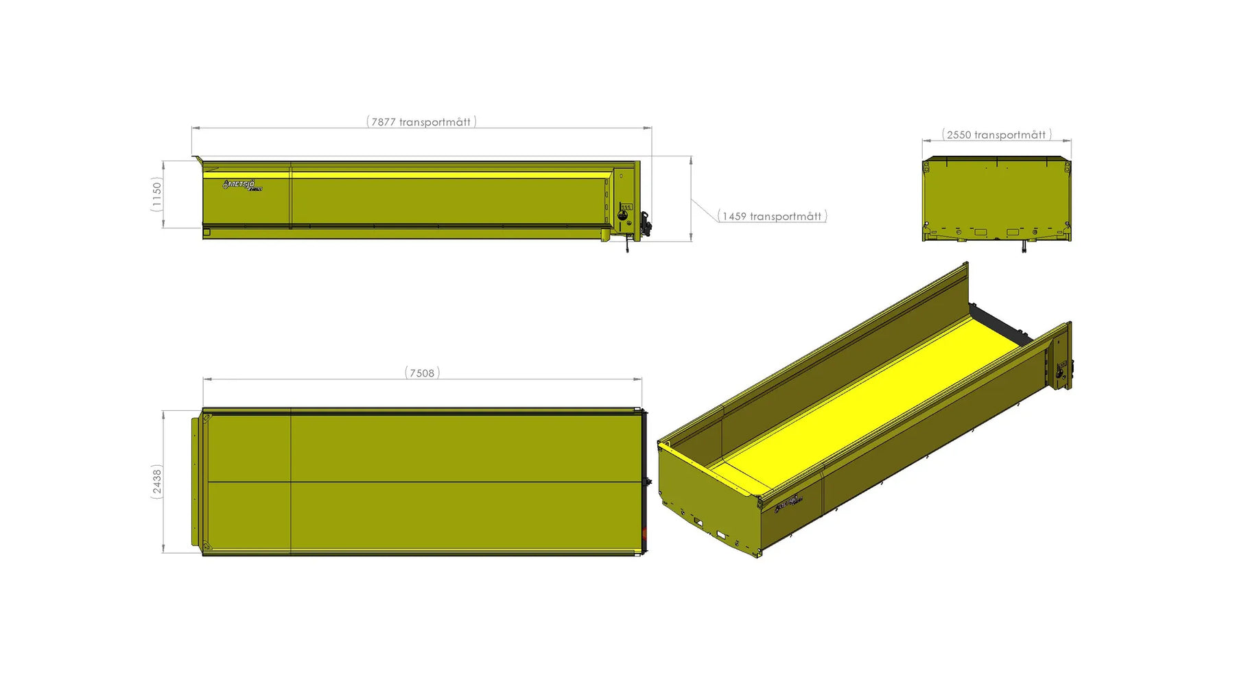 Abschrägung zur Pritsche 3x30" Hydraulische Schwerlastheckklappe H 300 mm Verschleißblech Brinell 450 Stärke Boden 6 mm, Seiten 6 mm Passt für Kies Universalhaken zur Ladesicherung aussen/innen Befestigungspunkten für verschiedene Heckklappen Befestigungspunkten für einen Getreideaufsatz Befestigungspunkten für Standbeine der Mulde Farbe Gelb, lackiert gemäß Metsjö Standard Passt auf MetaQ75 und Olympia 75 Fahrgestell Gewicht 2800 kg
