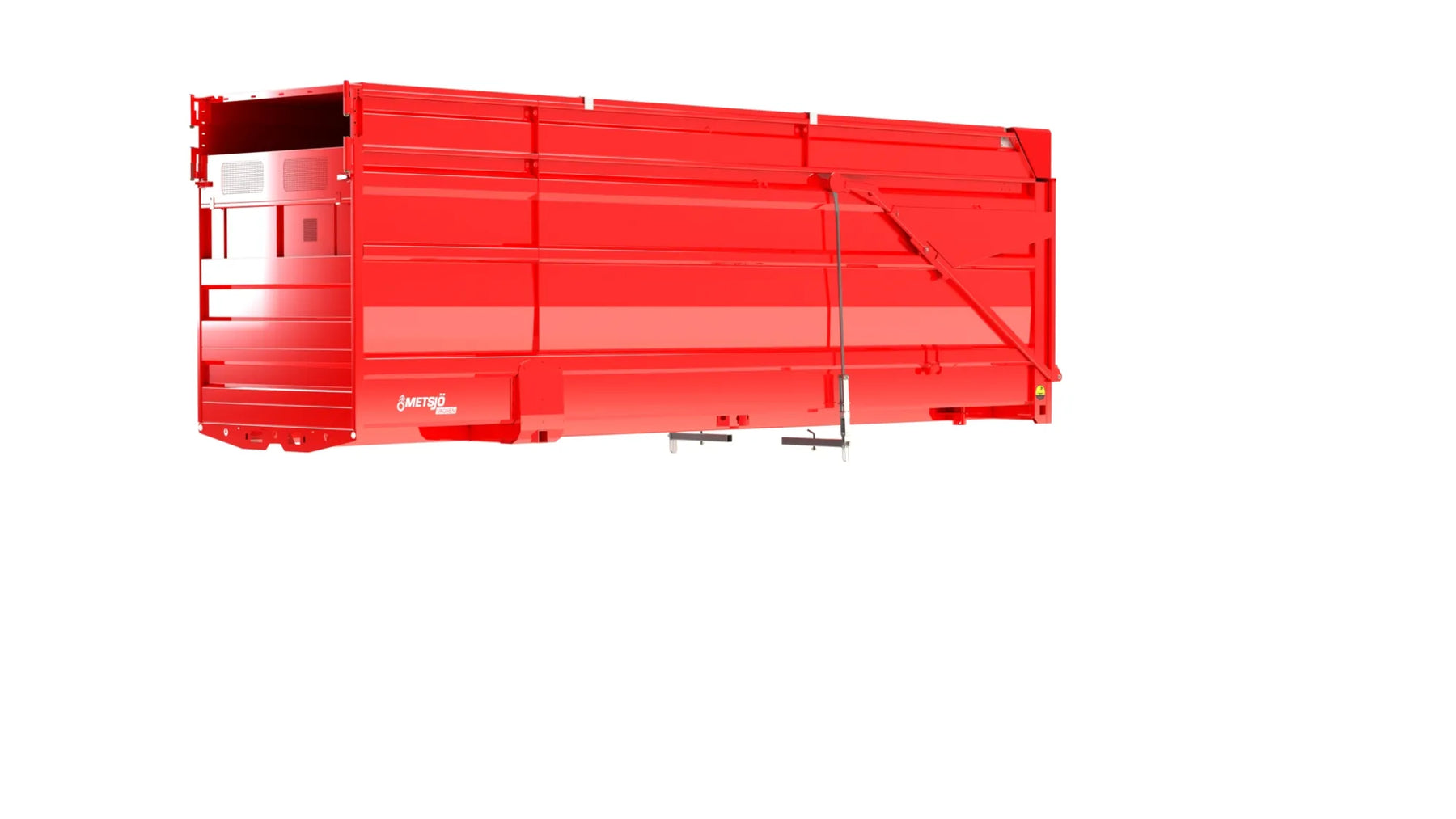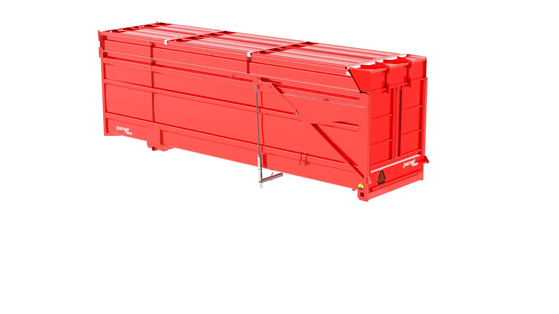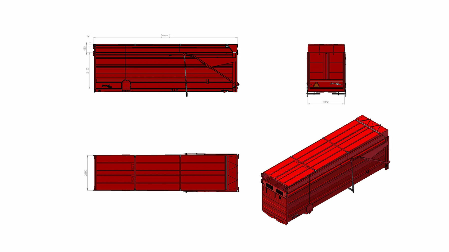 Verschleißblech Brinell 450 Stärke Boden 3,2 mm, Seiten 2mm Abschrägung zur Pritsche 2x45" Automatische Heckklappe - beim Kippen automatisch geöffnet Möglichkeit das Öffnen der Heckklappe zu verzögern Das Oberteil der Vorderwand ist demontierbar 450mm Ladebereich=Höhe 3000mm (bei Reifenwahl mit Durchmesser 1400mm, Total Höhe 4,5m) Konische Mulde 100mm Standard mit Dach Befestigungspunkten für Zubehör "Dichtung der Heckklappe" Befestigungspunkten für Zubehör "hydraulische Öffnung der Heckklappe" Befestigungspunkten für ein Dach/Aufsatz Befestigungspunkten für Standbeine der Mulde Farbe Rot, lackiert gemäß Metsjö Standard Passt auf MetaQ95 und Olympia 95 Fahrgestell Gewicht 3 730 kg Ausgestattet mit: Demontierbare Vorderwand H450, 124625-Röd