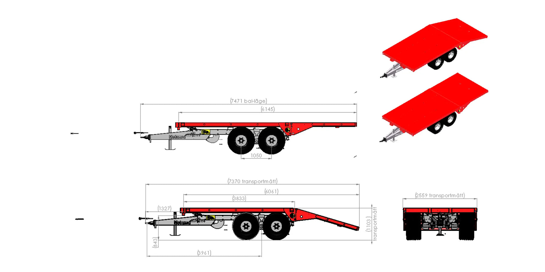 Item number chassis: 110132 Pendulum bogie distance 1050 mm, Maximum load 6 tons per axle Flange width 1850 mm. Coated according to KTL-method, black Rim connection 161x205x6 open nuts Hydraulic brakes: on all drums, According VVFS 2003:20 Manually adjusted brake arms. Maximum hydraulic pressure 110 bar Cover sheets stop dirt entering the brake drums Back tipping, tipping angle 55º, Oil volume 10L /210 bars Lights according TSV LED 12-24V 7 pol. Prepared console for mounting an axle lifting system Prepared console for mounting different drawbars Colour Metsjö grey Prepared for MetaMid/MetaNo bodies Chassis weight 1 550 kg, Technical load 15 000 kg Item number container: 127037 Machinery/bale platform Mid/No L6265 W2550 Heavy duty Steel 450 Brinell: Platform bed 2mm Flat part of the platform 3925mm, foldable ramp 2340mm, Total length 6265mm The rear LED lights 12/24V are inbuilt in the platform bed Hooks for load securing - outside lining of the platform, distance 900mm Load securing holes in flat part of the platform, distance 1015mm Consols for mounting different options for bale transport L5420mm Consols for mounting a plate for reducing the risk of slippering Consols for mounting supporting legs on the containers Colour red, painted according Metsjö standards Fits on MetaMid and MetaNo chassis Used to transport bales, machines and boxes For machines with rubber tires only Shifting between bale/machinery platform is done through the tipping function. Take away the pins on the side and tipp the platform till it reaches the ground. Proceed untill the platform is flat and then return the pins to their place. Control the total height as well as that you get the required payload on the tractor. Weight 910 kg Weight of the trailer 2460 kg, Payload 12 540 kg Surface treatment: chemical degreasing, blasting SA 2,5 The body is puttied. Painting according ISO 12944 A3.09. Colour system: Epoxy primer 2 x 70 µm. Top coat: Polyurethane 1 x 60 µm overall layer 200µm. Corrosion category C4 L Equipped with: Rear hydraulic outlet ½ flow, 106643 Rear hydraulic brake outlet, 106642 Rear coupler bolt-on clevis + rear electrical socket 7 pol., 105366