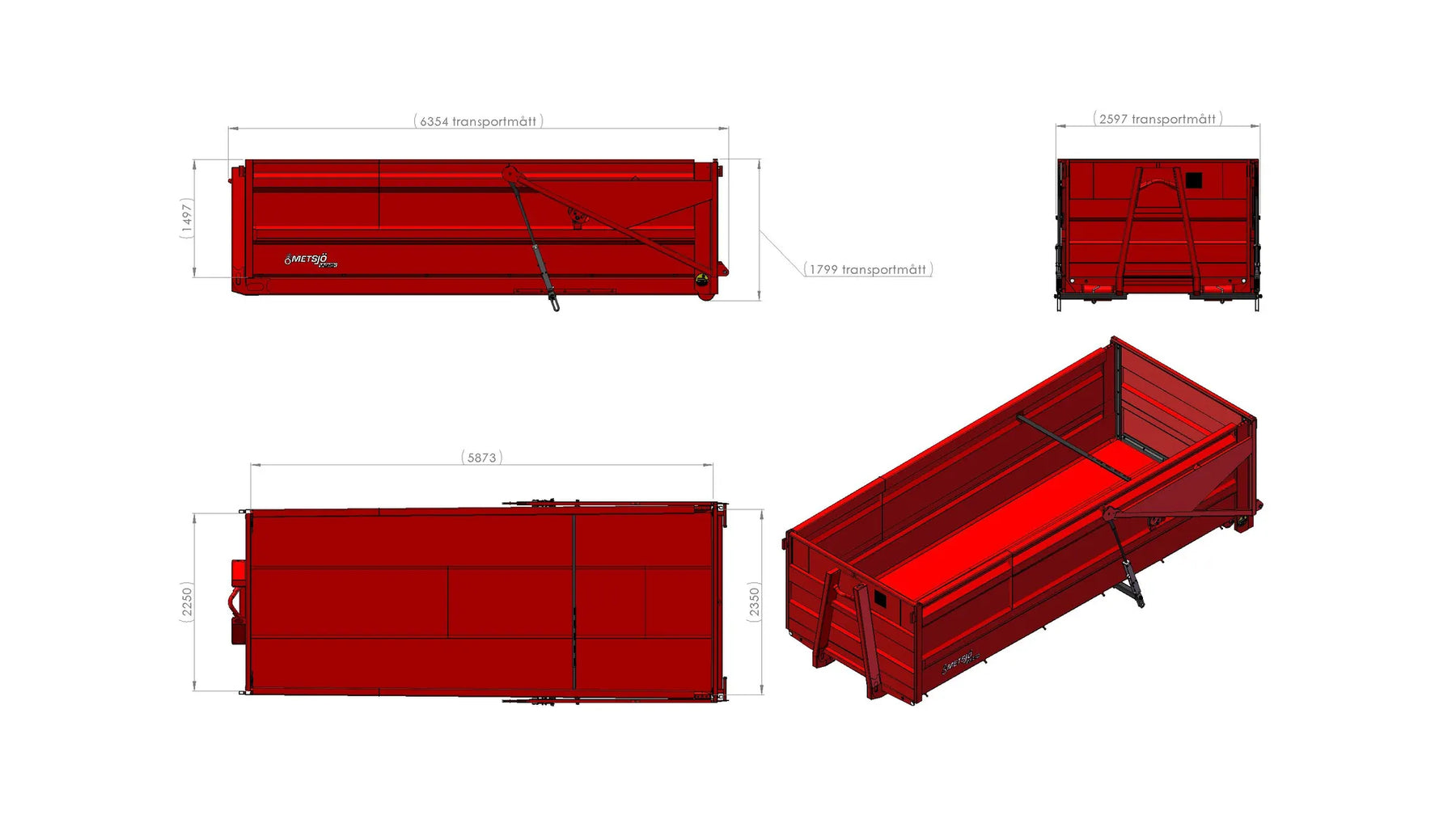Hook height 1450mm, Contanier standard SIS 3021 Heavy duty Steel 450 Brinell: Container bed 3,2 mm Steel 355 Brinell: Sides 2 mm Automatic tailgate - opens automatically when the body is tipped The opening can be delayed Perforated sight window 500x2000 with cover plate Conical body 100mm Hooks for load securing - outside Colour red, painted according Metsjö standards Weight 1 990 kg
