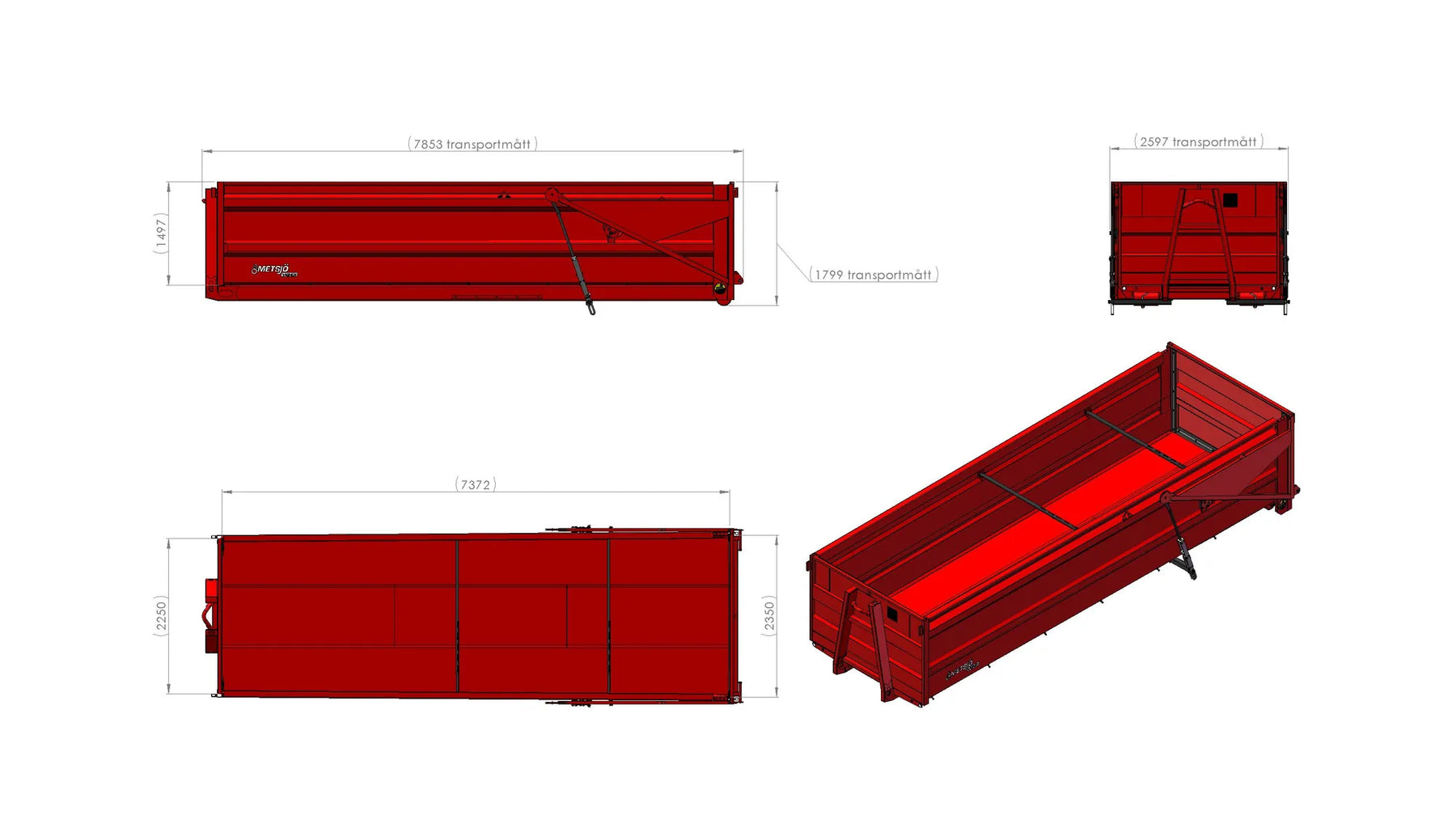 Hook height 1450mm, Contanier standard SIS 3021 Heavy duty Steel 450 Brinell: Container bed 3,2 mm Steel 355 Brinell: Sides 2 mm Automatic tailgate - opens automatically when the body is tipped The opening can be delayed Perforated sight window 500x2000 with cover plate Conical body 100mm Hooks for load securing - outside Colour red, painted according Metsjö standards Weight 2 320 kg