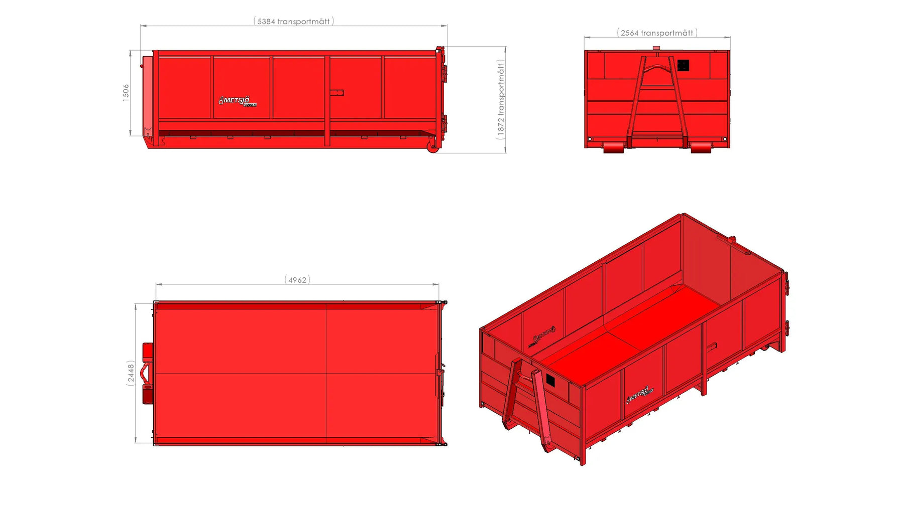 Hook height 1450mm, Contanier standard SIS 3021 Heavy duty Steel 450 Brinell: Container bed 3,2 mm Steel 355 Brinell: Sides 2 mm Rear doors: open at 270". Adjustable opening limitation. Perforated sight window 500x2000 with cover plate Conical body 100mm Hooks for load securing - outside Colour red, painted according Metsjö standards Weight 1 900 kg