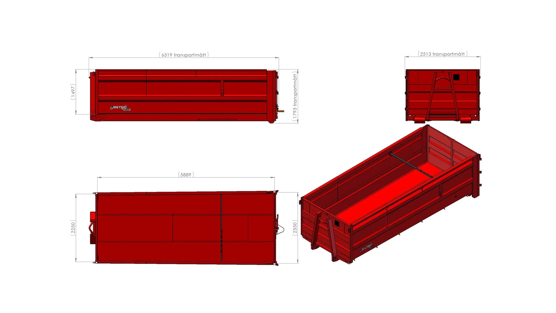 Hook height 1450mm, Contanier standard SIS 3021 Heavy duty Steel 450 Brinell: Container bed 3,2 mm Steel 355 Brinell: Sides 2 mm Rear doors: open at 270". Adjustable opening limitation. Perforated sight window 500x2000 with cover plate Conical body 100mm Hooks for load securing - outside Colour red, painted according Metsjö standards Weight 1 800 kg