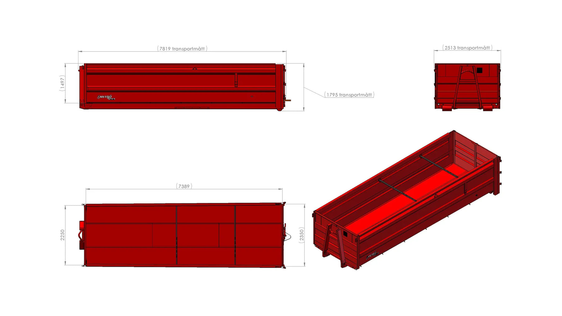 Hook height 1450mm, Contanier standard SIS 3021 Heavy duty Steel 450 Brinell: Container bed 3,2 mm Steel 355 Brinell: Sides 2 mm Rear doors: open at 270". Adjustable opening limitation. Perforated sight window 500x2000 with cover plate Conical body 100mm Hooks for load securing - outside Colour red, painted according Metsjö standards Weight 2 130 kg