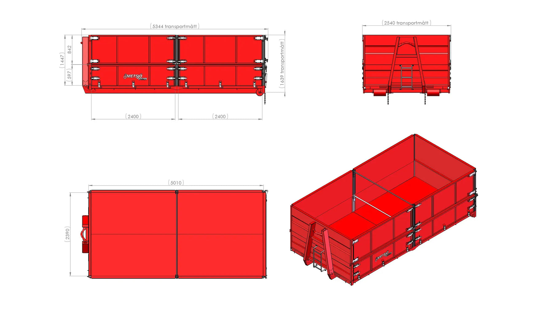 Hook height 1450mm, Contanier standard SIS 3021 Steel 355 Brinell: Container bed 4 mm and lower sides 3 mm / upper 2mm Manuall lower tailgate H600 mm "Multi-hinged" top pivoted/foldable downwards Manuall upper tailgate H600 mm "Side-hinged" Drop-down lower sides, Height 600mm, Length per section 2 400mm Upper sides "Side-hinged" , Height 850mm, Length per section 2 400mm 3 hinge fittings and 4 locks per section Front wall height 600mm+850mm=1450mm Stabilising bar between the side panels Hooks for load securing 1,5 tons outside 8pcs. per side Colour red, painted according Metsjö standards Weight 2000 kg