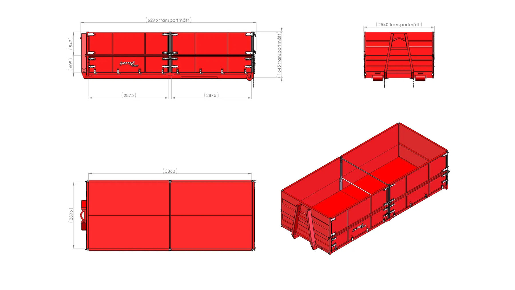 Hook height 1450mm, Contanier standard SIS 3021 Steel 355 Brinell: Container bed 4 mm and lower sides 3 mm / upper 2mm Manuall lower tailgate H600 mm "Multi-hinged" top pivoted/foldable downwards Manuall upper tailgate H600 mm "Side-hinged" Drop-down lower sides, Height 600mm, Length per section 2 800mm Upper sides "Side-hinged" , Height 850mm, Length per section 2 800mm 4 hinge fittings and 4 locks per section Front wall height 600mm+850mm=1450mm Stabilising bar between the side panels Hooks for load securing 1,5 tons outside 8pcs. per side Colour red, painted according Metsjö standards Weight 2390 kg