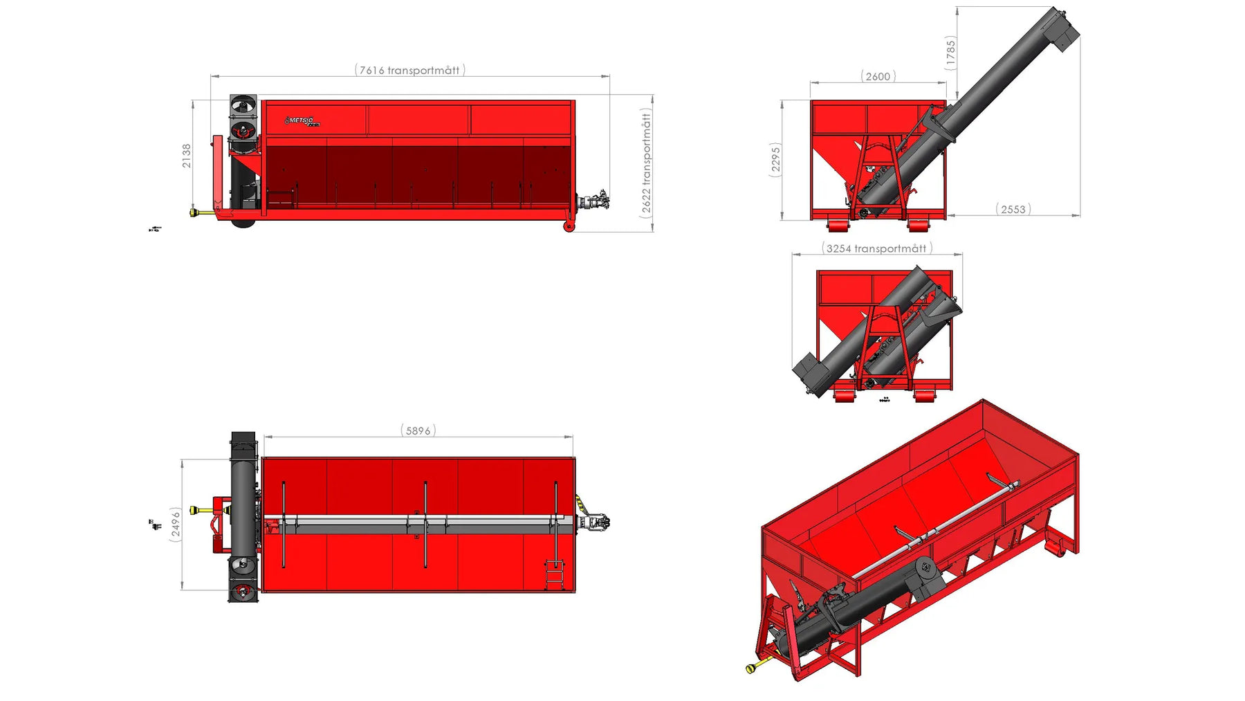 Hook height 1450mm, Contanier standard SIS 3021 Steel 355 Brinell: lower side 3 mm / upper side 2mm 1 shutter in the front at the unloading auger 1 shutter in the bottom feeding Mechanically adjustable inner V - sheet over the feeding auger (for different crop densities) Sight window on the front wall (perforated)-cover sheet available (not standard) 1 ladder on the rear wall (excluded if equipped with standing platform) 1 ladder inside of the body Hydr.folding of unloading auger,transport/loading position with an over centre valve Auger driven by hydr.motor which works in both directions Hydr.flow 90l/min at 180 bar Unloading time 3 min (wheat with a moisture of 20%) Measurements: Length 6 000mm, Width 2 600mm, Height 2 000mm Length with unloading auger 7 000mm Width transport position 3 100mm Width unloading position 5 050mm Height unloading position with wheel diameter 1 350mm: Total height 5 050mm and free height under auger 4 800mm Requires: 3 DA hydr.outlets Colour red, painted according Metsjö standards Weight 3 700kg
