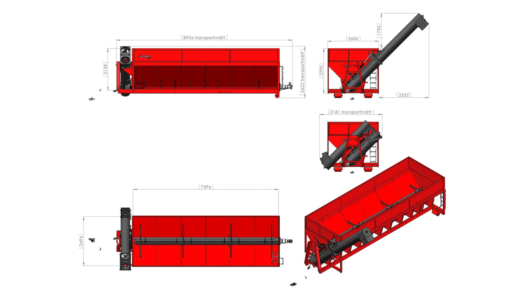 Hook height 1450mm, Contanier standard SIS 3021 Steel 355 Brinell: lower side 3 mm / upper side 2mm 1 shutter in the front at the unloading auger 1 shutter in the bottom feeding Mechanically adjustable inner V - sheet over the feeding auger (for different crop densities) Sight window on the front wall (perforated)-cover sheet available (not standard) 1 ladder on the rear wall (excluded if equipped with standing platform) 1 ladder inside of the body Hydr.folding of unloading auger,transport/loading position with an over centre valve Auger driven by hydr.motor which works in both directions Hydr.flow 90l/min at 180 bar Unloading time 3 min (wheat with a moisture of 20%) Measurements: Length 7 500mm, Width 2 600mm, Height 2 000mm Length with unloading auger 8 500mm Width transport position 3 100mm Width unloading position 5 050mm Height unloading position with wheel diameter 1 350mm: Total height 5 050mm and free height under auger 4 800mm Requires: 3 DA hydr.outlets Colour red, painted according Metsjö standards Weight 4 170kg