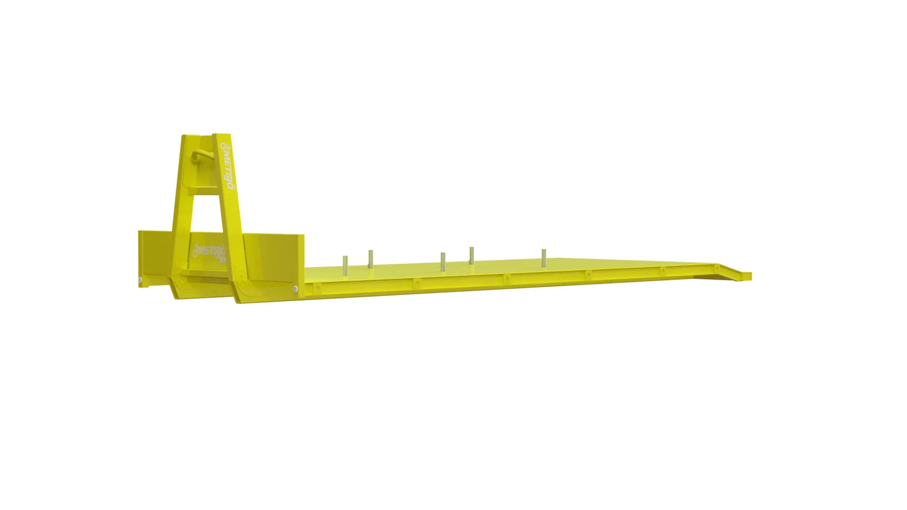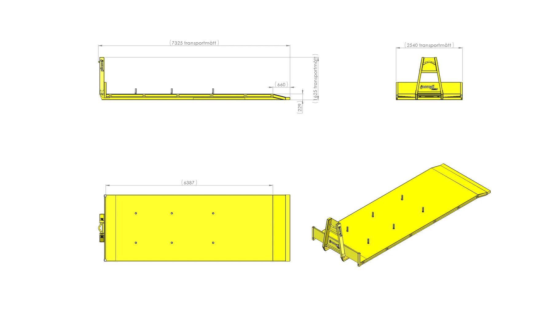 Hook height 1450mm, Contanier standard SIS 3021 The frame is without rear rollers-makes it easier to drive up Floor hieght 100mm Heavy duty Steel 450 Brinell: Platform bed 6mm Flat part of the platform 6350mm, foldable ramp 650mm, Total length 7000mm Hooks for load securing - outside lining of the platform Load securing holes in flat part of the platform The platform has a structured surface that reduces the risk of slipping Colour yellow, painted according Metsjö standards Weight 2090 kg