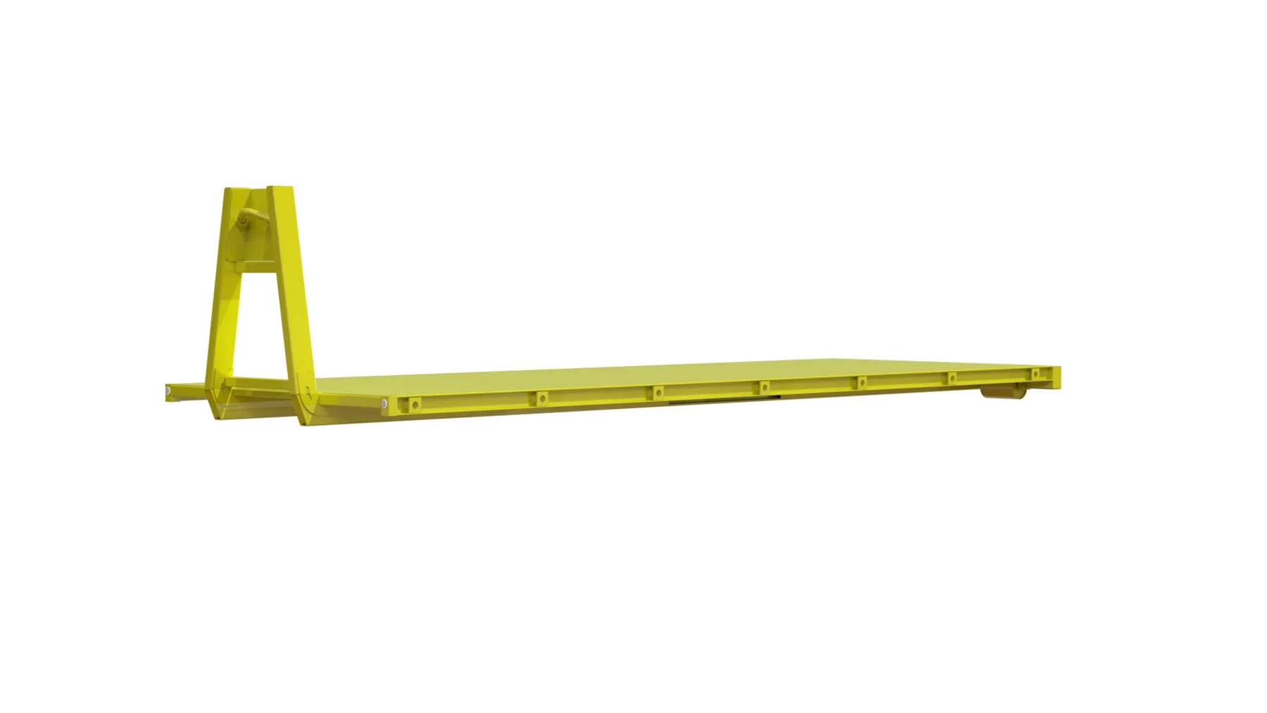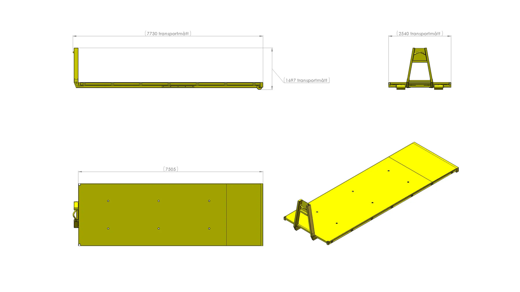 Hook height 1450mm, Contanier standard SIS 3021 Heavy duty Steel 450 Brinell: Platform bed 6mm Hooks for load securing - outside lining of the platform Load securing holes in flat part of the platform The platform has a structured surface that reduces the risk of slipping Colour yellow, painted according Metsjö standards Weight 2200 kg