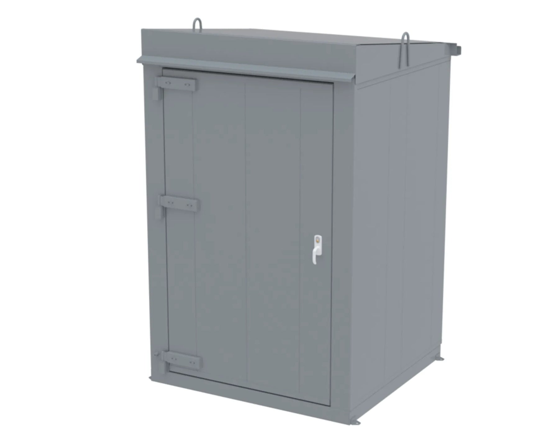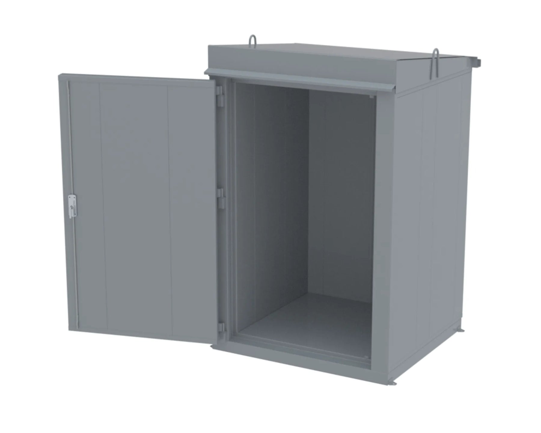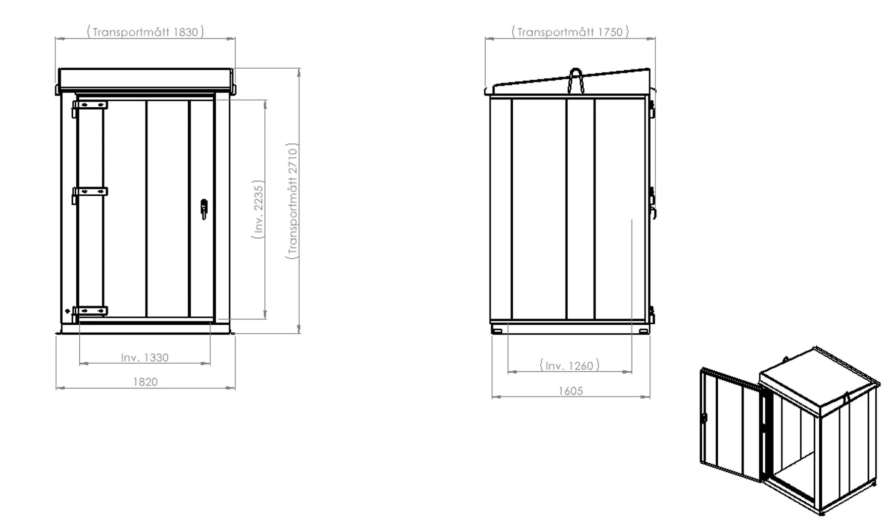 Internal dimensions W.H.D 1350x1590x1260 mm. Transport dimensions W.H.D 1830x2710x1750 mm. Cabinet weight: 1300 kg. Containment sump, 1050 liters For 1 IBC, 1 euro pallet or 4 200L drums directly on the floor. Insulated according to the requirement for EI60 separation. The construction is tested according to NT Fire 017. Construction of 1.5 mm steel sheet, fully welded. Floor of grid flooring, height 800mm from ground level. Approved insurance class 2. Door opening 160°, cylinder lock type espagnolette. Roof grille for water drainage on the right and left sides. Ventilation natural draft, ≥1% of floor area, under and above door leaf. Heat-expanding gasket in door. Extra shelves are available. Pipe- and cable entries are available on request. Surface treatment acc. to ISO 12944: Pretreatment with alkaline degreasing and blasting Sa 2.5 C4-Med. Epoxi base-coat, Polyurethane top-coat. Internally C3 acc. to Metsjö standard. Creates a surface that retains gloss and color and is easy to clean.