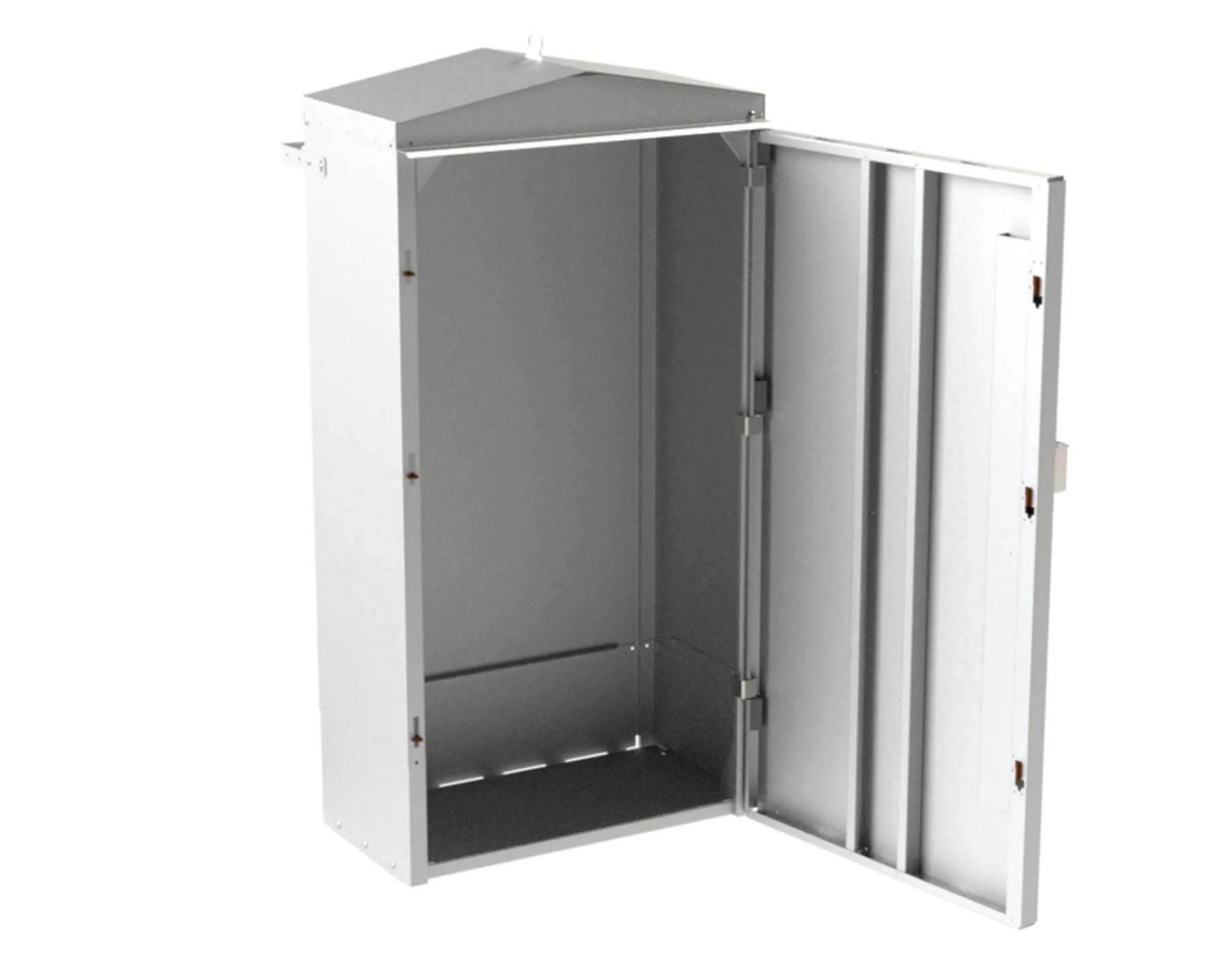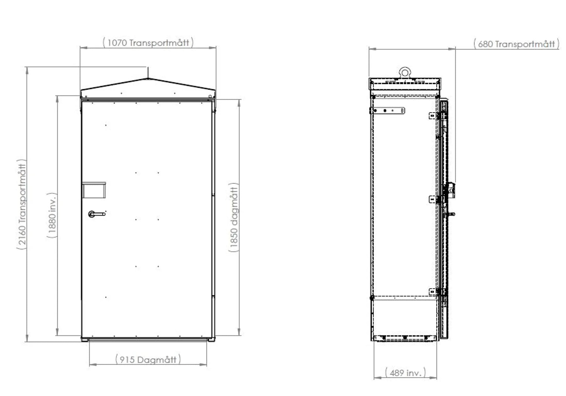 Gas storage 151105 type 290. 1 door, for outdoor use. Uninsulated. Internal mesurements W.H.D 1040x1880x480 mm. External mesurements W.H.D 1070x2160x680 mm. Door mesurement W.H 915x1850, opens to 100º. Weight: 150 kg Constructed by riveted and bolted zink coated steel plate, ZnAlMg. This is a steel coated for tough environments. ZnAlMg has significantly better corrosion resistance than tradidtional hot-dip galvanized materials, and contains the ability to self-heal scratched surfaces. The ZnAlMg plate provides a harder surface than galvanized material. Locked by 3-point locking-hook, secured by the recipient's padlock (shackle height 25mm). Ventilation: Natural draft, 1% of floor area, under and above the door frame. Internally placed mounting bracked, for gas equipment. Brackets, for bolting cabinet to ground/wall.