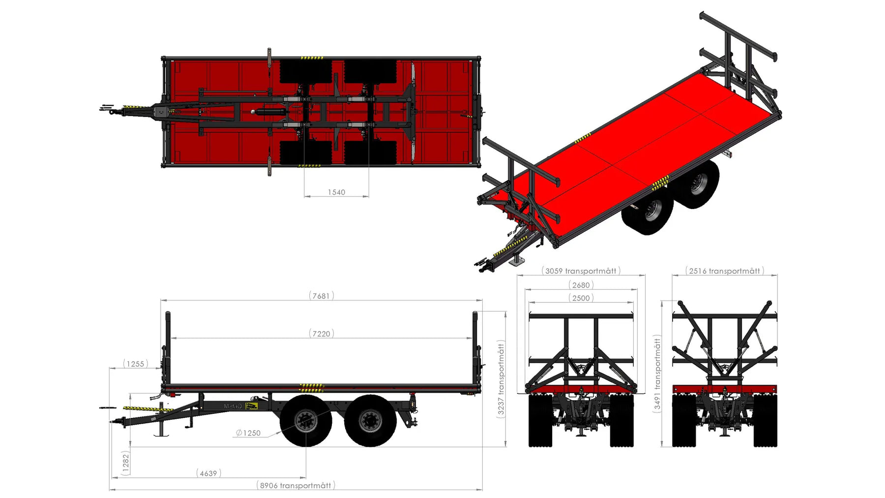 Item number chassis: 110140 Axles: one-piece axel body 120x120, Flange width 2 000 mm Load: 10,5 ton at 62 km/h, laser aligned Coated according KTL-method, black Axle distance 1 540mm, Axle system: Road Rim connection 280x335x10, domed nuts Communicating vessels: The chassis height is adjustable (from the chassis) 350mm Hydraulic brakes on all drums. Size 410x120. According VVFS 2003:20 Automatically adjusted brake arms AGS. Maximum hydraulic pressure 110 bar Cover sheets stop dirt entering the brake drums Back tipping, Tipping angle 52, Oil volume 25L/210 bars, Electrical system 12 Volt Lights according TSV LED 12-24V 7 pol. Connection points for an automatic tailgate Prepared console for mounting different drawbars Colour Metsjö grey Prepared for MetaQ60 bodies Chassis weight: 3 000 kg, Technical load: 24 000 kg Item number container: 130718 Transport/bale platform MQ60 L7200 B2550 Steel 355 Brinell: Container bed 4 mm Distance from drawbar to platform 1 400mm Support weight 20% (support weight on standard tipping bodies 60%) While loading the goods, the driver must assure himself that the required support weight is available, so he can secure the load This platform cannot be used in a trailer combination (connected with a second trailer) This platform can be tipped Hooks for load securing - outside lining of the platform Consols for mounting different options for bale transport Consols for mounting supporting legs on the containers Colour red, painted according Metsjö standards Fits on MetaQ 60 and Olympia 60 chassis Weight 1500 kg Hydraulic mooring L7200 mm. Grip width 2550mm - 2800mm Possibility to control only one of the sides (manual valve on the drawbar) Grip power with 200 bars- 1300kg per pipe. Side pressure max 6,5 tons Requires one double-acting hydraulic outlet Weight of the trailer 5350 kg, Payload 18 650 kg Surface treatment: chemical degreasing, blasting SA 2,5 The body is puttied. Painting according ISO 12944 A3.09. Colour system: Epoxy primer 2 x 70 µm. Top coat: Polyurethane 1 x 60 µm overall layer 200µm. Corrosion category C4 L Equipped with: Rear hydraulic outlet 1/2 flow, 106643 Rear hydraulic brake outlet, 106642 Rear coupler bolt-on clevis + rear electrical socket 7 pol., 105366