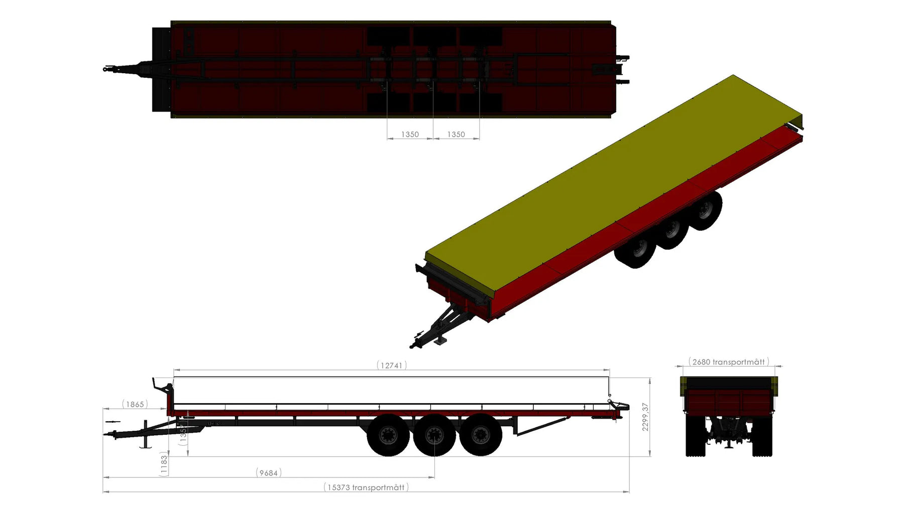 Artikelnummer komplett: 129781-13m Axlar: Hel axelkropp 120x120, Avstånd över navflänsar 2 000 mm Belastning 10,5 ton vid 62 km. Laserriktade. Ytbehandlade enligt KTL- metoden, svart Avstånd mellan boggiaxlar cc 1350 mm. Axelupphängning "Road" Medspårande axel med hydraulisk låsning vid backning (axel 3) Anslutning 280x335x10 kupolmutter Kommunicerande kärl: Hydrauliskt reglerbart chassi 350 mm vid chassit Bromsstorlek: 410x120. Hydrauliska bromsar på alla hjul - enligt VVFS 2003: 20, 5 Kap. 12 § Automatbromsarmar AGS. Max 110 bar hydraultryck. Skyddsplåt förhindrar smuts i trumma Belysning enligt TSV Diod 12/24 Volt 7 pol Fäste för valbart drag Färg Metsjö röd Artikelnummer flak: 131358 Transport/Balflak L13000 B2550 Plåt Brinell 355: Tjocklek Botten 4 mm Stödvikt 20% (stödvikt på standard tippflak 60 %) Vid lastning måste föraren av ekipaget förvissa sig om att erforderlig stödlast finns för säker transport i rådande förhållande Bindpunkter UTV flaklina Fäste för tillval H-grindar/balbåge/fram- och bakstam/hydr.mooring Lackas Metsjö Röd, karosseri kittas enligt Metsjö standard Hydraulisk Låda pusher - demonterbar Monterad i hylsor 120x120 bakstam Snabbkoppling DV uttag Tryckkraft 2500kg Slaglängd 220mm Syfte: Riktar lådor i ledet mot framstam Mitt monterad ståplattform L12735 Vikt 175 kg Gångkanal 250x200. Halksäkrad Tårplåt Bultad: Sektion L3000, Vikt 35kg/sektion Kapellvila i framstam. Pressening rullas - Vagnens längsriktning Pressening skruvas i kapellvilla Upprulle Alu Dia 63 L 2600 Vikt 50kg Utdragbar lådstege In byggd kapslad kassett. L550 antal steg 3st Lutning 38" Vagns vikt 6670 kg, Nyttolast 27 830 kg (TSV 20330 kg) Ytbehandling: Förbehandling med alkalisk avfettning och blästring Sa 2,5 Karosseri kittas. Lackerat enl. ISO 12944 A3.09. Färgsystem: Epoxiprimer 2 x 70 µm. Täckfärg: Polyuretan 1 x 60 µm totalskikt ca. 200µm. Korrosivitetklass C4 L Kringutrustning. Hydrauluttag bak 2st. Pusher, 131481 Mittramp H200 B250, 131459 Kapellvilla, 131552 Framstam, 103259-Röd Stötta framstam 100x100 Utdragbar lådstege 2st