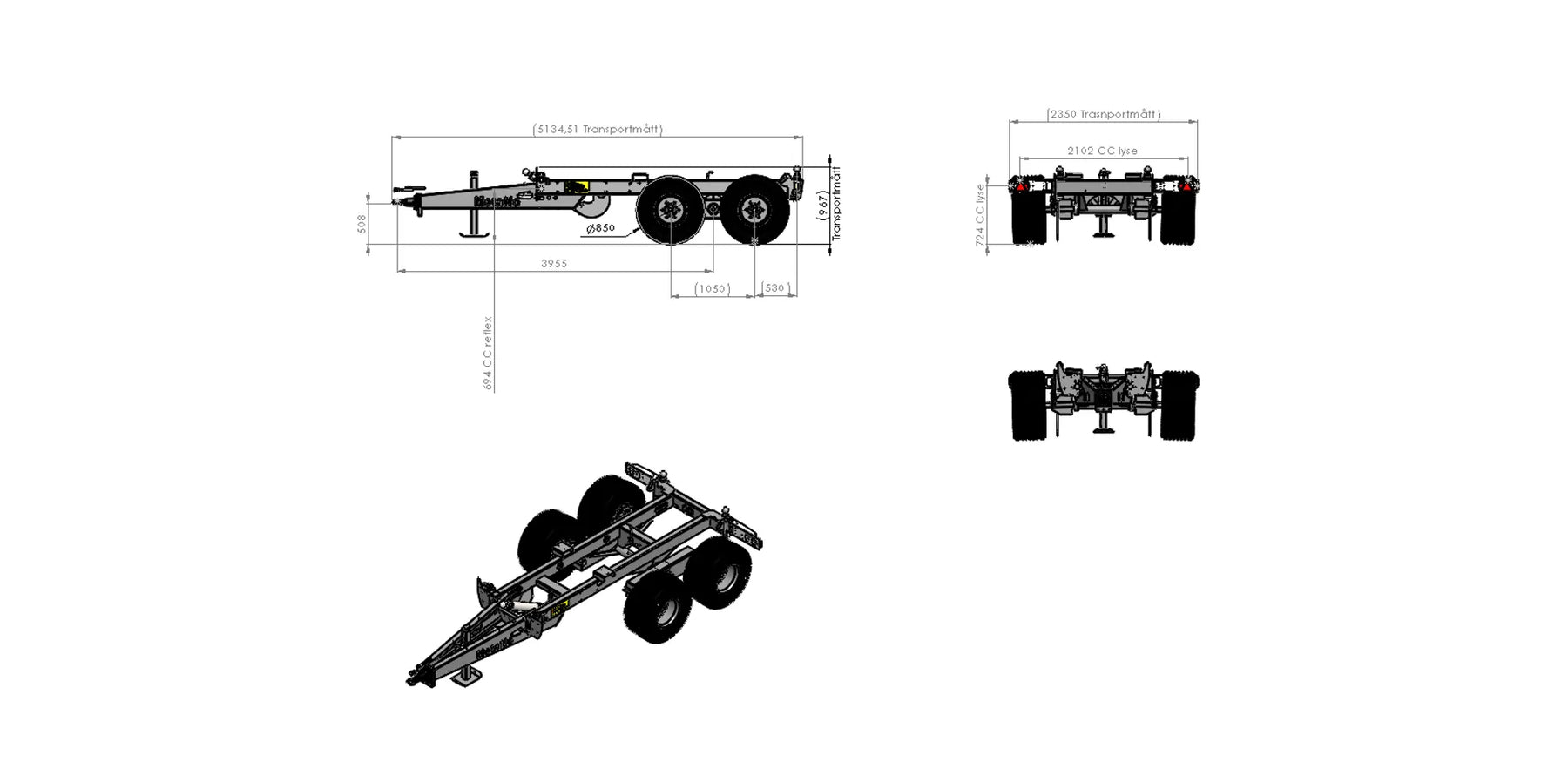 Item number chassis: 104380 Pendulum bogie distance 1050 mm, Maximum load 4,5 tons per axle Flange width 1850 mm. Coated according to KTL-method, black Rim connection 161x205x6 open nuts Hydraulic brakes: on all drums, According VVFS 2003:20 Manually adjusted brake arms. Maximum hydraulic pressure 110 bar Cover sheets stop dirt entering the brake drums Back tipping, tipping angle 55º, Oil volume 10L /210 bars Lights according TSV LED 12-24V 7 pol. Prepared console for mounting different drawbars Colour Metsjö grey Prepared for MetaMid/MetaNo bodies Chassis weight 1 450 kg, Technical load 12 000 kg, Payload 10 550 kg Surface treatment: chemical degreasing, blasting SA 2,5 The body is puttied. Painting according ISO 12944 A3.09. Colour system: Epoxy primer 2 x 70 µm. Top coat: Polyurethane 1 x 60 µm overall layer 200µm. Corrosion category C4 L