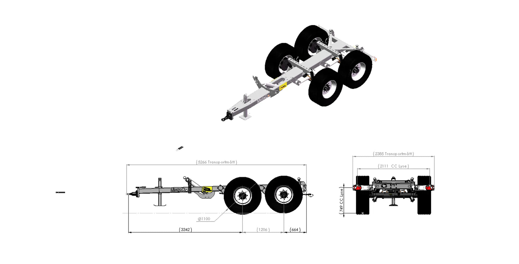 Item number 152110 Axles: one-piece axel body 110x110, Flange width 1 800 mm Load: 8,5 ton at 50 km/h, laser aligned Coated according KTL-method, black Axle distance 1 150mm, Axle system: Road Rim connection 280x335x10, domed nuts Communicating vessels: The chassis height is adjustable (from the chassis) 350mm Hydraulic brakes on all drums. Size 410x110. According VVFS 2003:20 Automatically adjusted brake arms AGS. Maximum hydraulic pressure 110 bar Cover sheets stop dirt entering the brake drums Back tipping, tipping angle 55º, Oil volume 10L /210 bars, Electrical system 12 Volt Lights according TSV LED 12-24V 7 pol. Prepared console for mounting different drawbars Colour Metsjö grey Prepared for MetaMid/MetaNo bodies Chassis weight 1 560 kg, Technical load 17 000 kg, Payload 15 000 kg Surface treatment: chemical degreasing, blasting SA 2,5 The body is puttied. The colour of the chassis is grey Painting according ISO 12944 A3.09. Colour system: Epoxy primer 2 x 70 µm. Top coat: Polyurethane 1 x 60 µm overall layer 200µm. Corrosion category C4 L Equipped with: Rear hydraulic outlet 1/2 flow, 106643 x 2 pcs.
