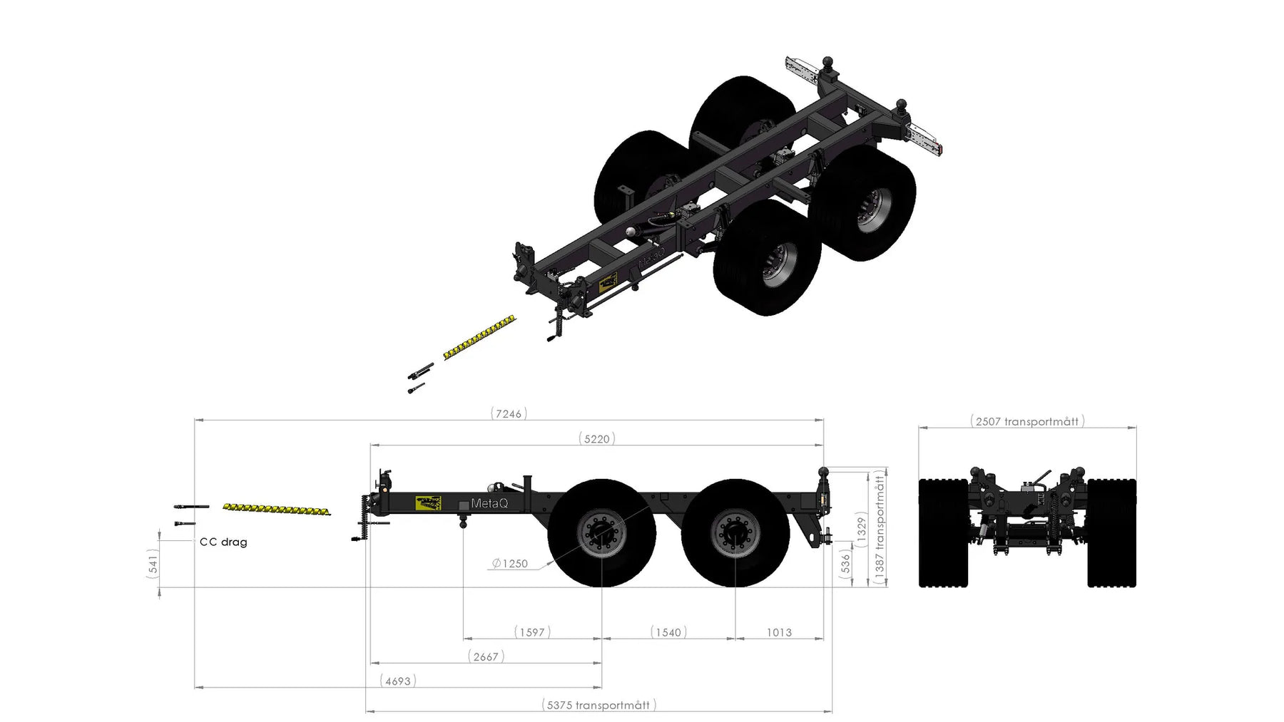 Item number chassis: 110143 The Multi-coupling drawbar is bought separately Axles: one-piece axel body 120x120, Flange width 2 000 mm Load: 10,5 ton at 62 km/h, laser aligned Coated according KTL-method, black Axle distance 1 540mm, Axle system: Road Rim connection 280x335x10, domed nuts Communicating vessels: The chassis height is adjustable (from the chassis) 350mm Hydraulic brakes on all drums. Size 410x120. According VVFS 2003:20 Automatically adjusted brake arms AGS. Maximum hydraulic pressure 110 bar Cover sheets stop dirt entering the brake drums Back tipping, Tipping angle 52, Oil volume 25L/210 bars, Electrical system 12 Volt Lights according TSV LED 12-24V 7 pol. Connection points for an automatic tailgate Prepared console for mounting different drawbars Colour Metsjö grey Prepared for MetaQ60 bodies Chassis weight: 2 800 kg, Technical load: 24 000 kg, Payload 21 200 kg Surface treatment: chemical degreasing, blasting SA 2,5 The body is puttied. Painting according ISO 12944 A3.09. Colour system: Epoxy primer 2 x 70 µm. Top coat: Polyurethane 1 x 60 µm overall layer 200µm. Corrosion category C4 L Equipped with: Rear coupler bolt-on clevis + rear electrical socket 7 pol., 105366