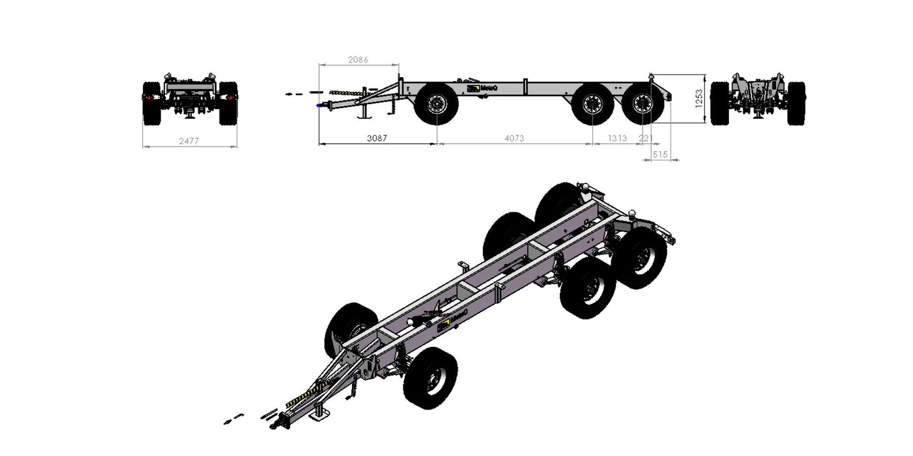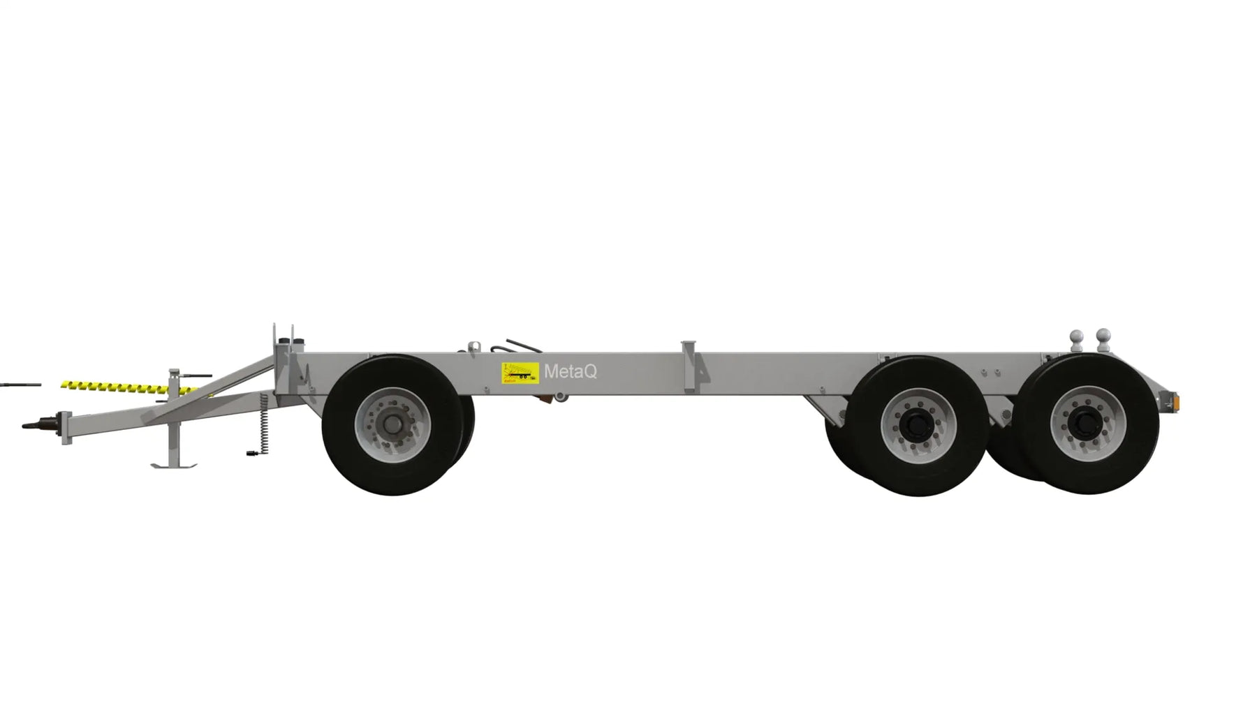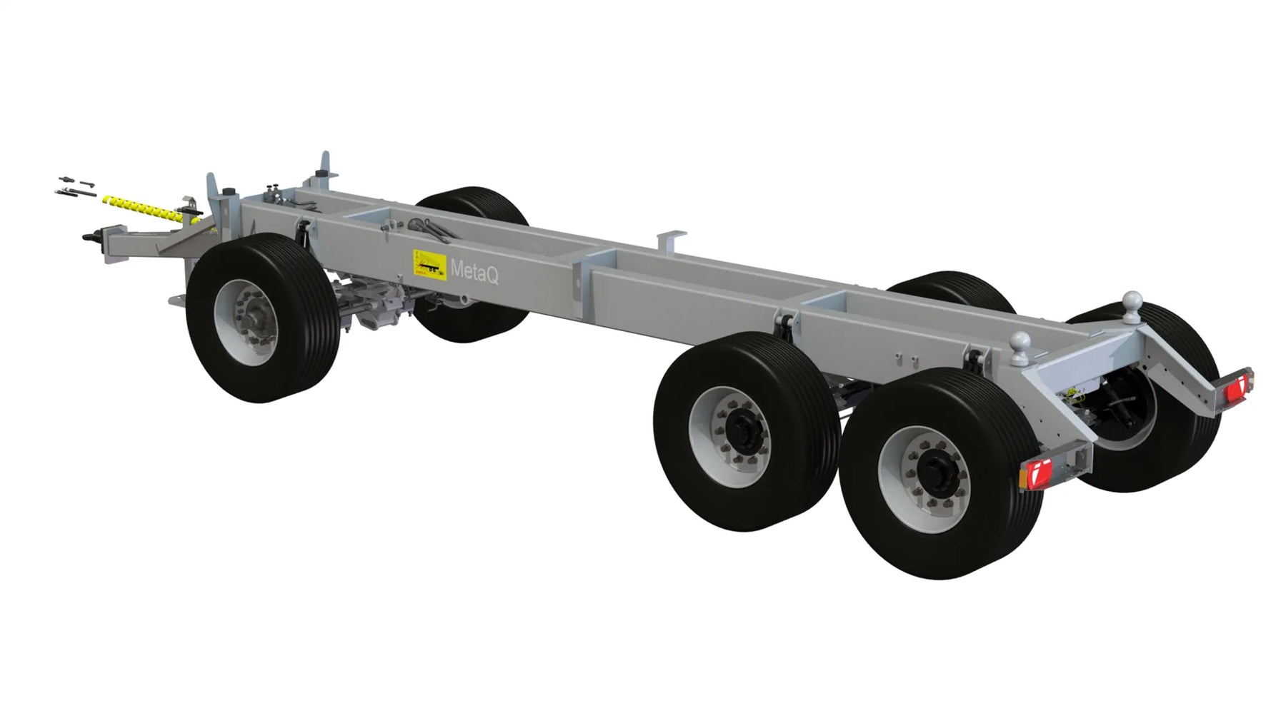 Item number chassis: 150684 Axles: one-piece axel body 120x120, Flange width 2 000 mm Load: 10,5 ton at 62 km/h, laser aligned Coated according KTL-method, black Axle distance Axle 1-3 5410mm; Axel 2-3 1310mm 27 tons on the axles+ 4 tons on the coupling = 31 tons total weight Axle system: Road Self steering axle with hydraulic locking when reversing (axle 3) with extra steerign angle 28" Rim connection 280x335x10, domed nuts Communicating vessels: The chassis height is adjustable (from the chassis) 350mm Hydraulic brakes on all drums. Size 410x120. According VVFS 2003:20 Automatically adjusted brake arms AGS. Maximum hydraulic pressure 110 bar Cover sheets stop dirt entering the brake drums Back tipping, Tipping angle 52, Oil volume 45L/210 bars, Electrical system 12 Volt Lights according TSV LED 12-24V 7 pol. Prepared console for mounting different drawbars Colour Metsjö grey Prepared for MetaQ75 bodies Chassis weight: 3 600 kg, Technical load: 34 500 kg, Payload 30 900 kg Surface treatment: chemical degreasing, blasting SA 2,5 The body is puttied. Painting according ISO 12944 A3.09. Colour system: Epoxy primer 2 x 70 µm. Top coat: Polyurethane 1 x 60 µm overall layer 200µm. Corrosion category C4 L