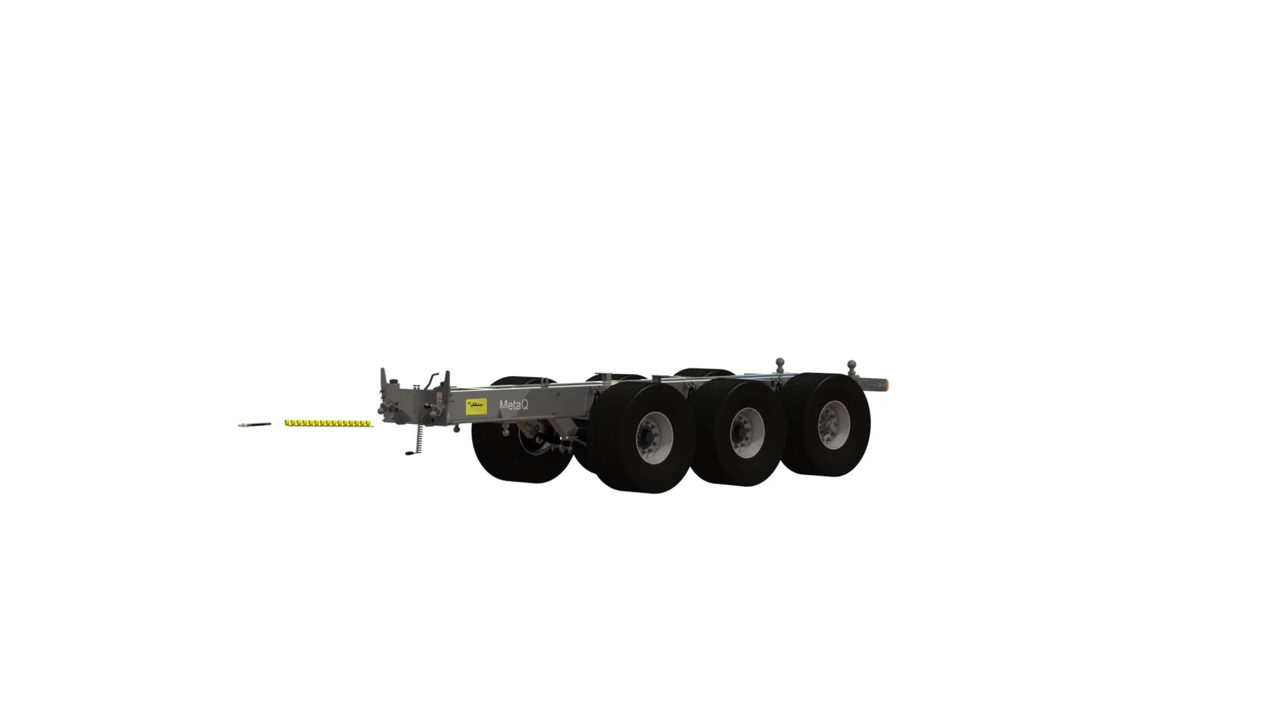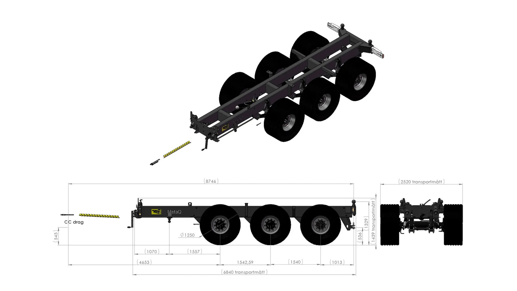 Item number chassis: 110279 The Multi-coupling drawbar is bought separately Axles: one-piece axel body 120x120, Flange width 2 000 mm Load: 10,5 ton at 62 km/h, laser aligned Coated according KTL-method, black Axle distance 1 540mm, Axle system: Road Self steering axle with hydraulic locking when reversing (axle 3) Rim connection 280x335x10, domed nuts Communicating vessels: The chassis height is adjustable (from the chassis) 350mm Hydraulic brakes on all drums. Size 410x120. According VVFS 2003:20 Automatically adjusted brake arms AGS. Maximum hydraulic pressure 110 bar Cover sheets stop dirt entering the brake drums Back tipping, Tipping angle 52, Oil volume 45L/210 bars, Electrical system 12 Volt Lights according TSV LED 12-24V 7 pol. Connection points for an automatic tailgate Prepared console for mounting different drawbars Colour Metsjö grey Prepared for MetaQ75 bodies Chassis weight: 4 120 kg, Technical load: 34 500 kg, Payload 30 180 kg Surface treatment: chemical degreasing, blasting SA 2,5 The body is puttied. Painting according ISO 12944 A3.09. Colour system: Epoxy primer 2 x 70 µm. Top coat: Polyurethane 1 x 60 µm overall layer 200µm. Corrosion category C4 L Equipped with: Rear coupler bolt-on clevis + rear electrical socket 7 pol., 105366