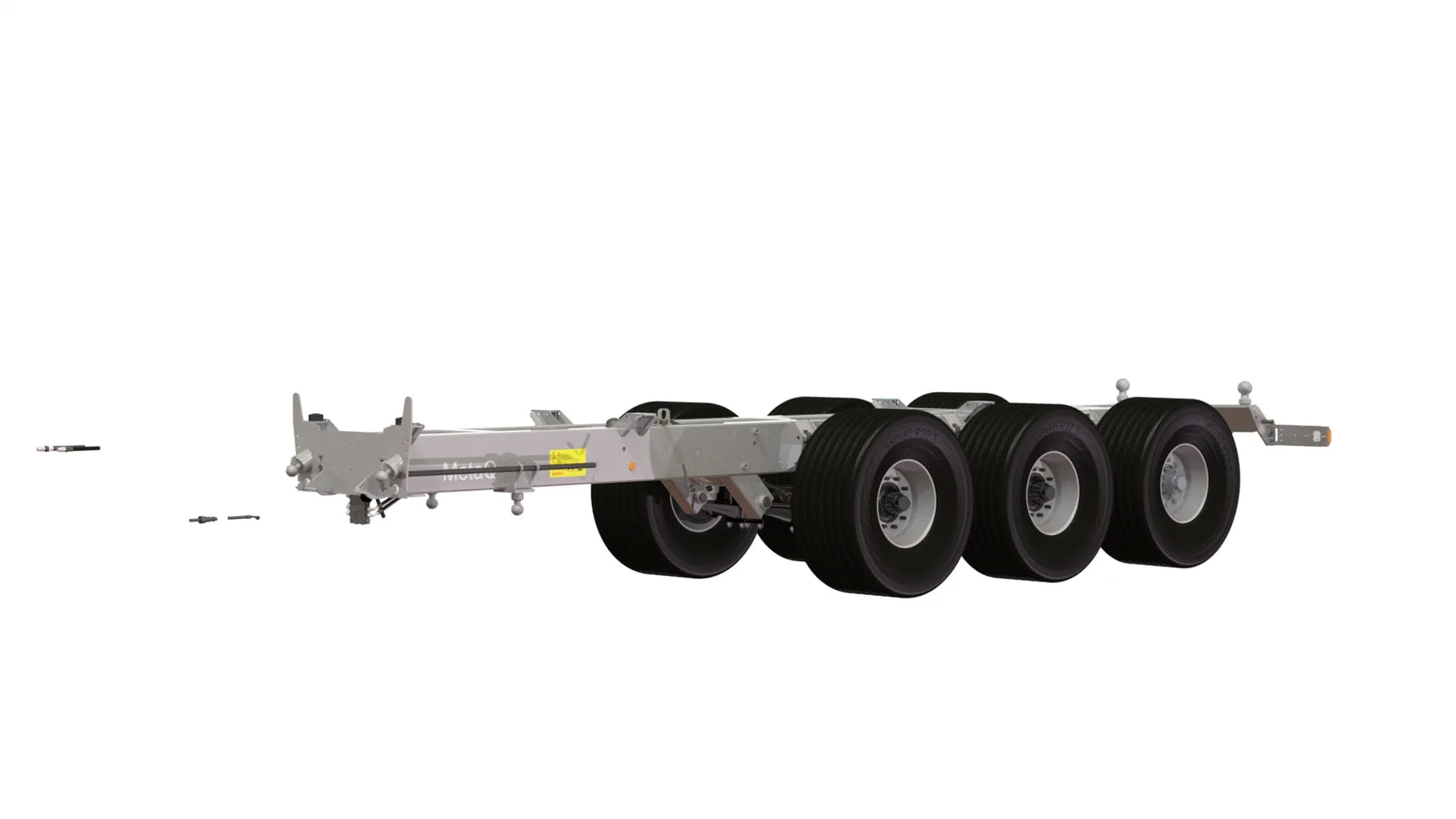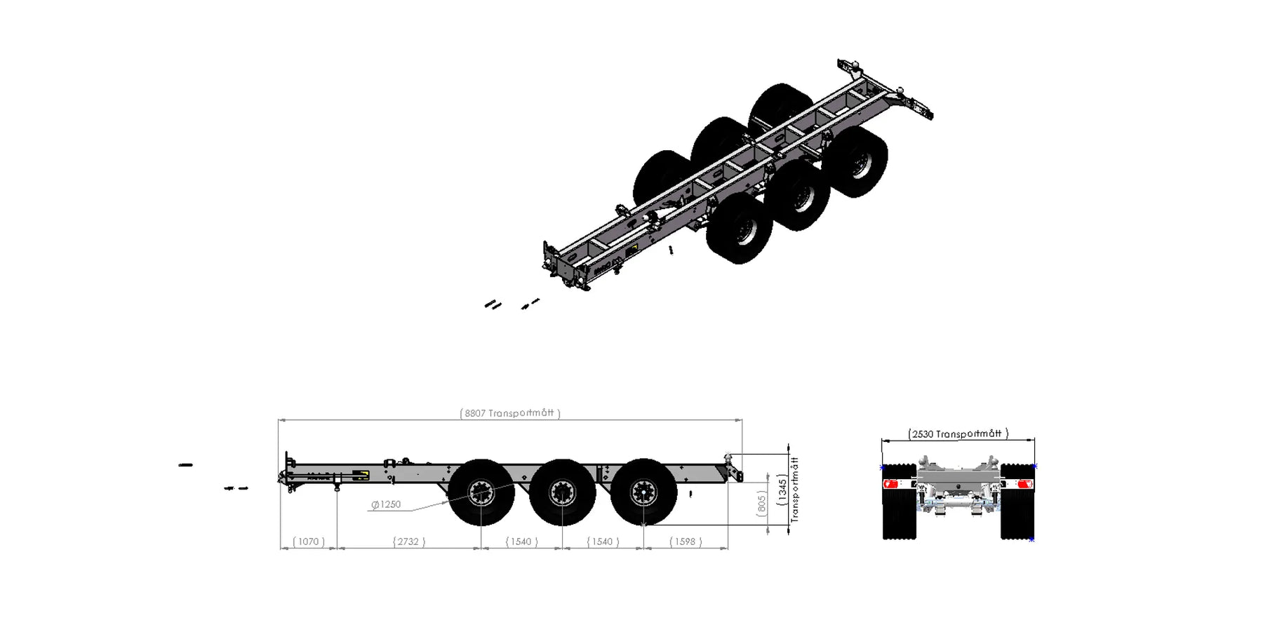 Item number chassis: 147033 The Multi-coupling drawbar is bought separately Axles: one-piece axel body 150x150, Flange width 2 000 mm Load: 12 ton at 62 km/h, laser aligned Coated according KTL-method, black Axle distance 1 540mm, Axle system: Road Self steering axle with hydraulic locking when reversing (axle 3) Rim connection 280x335x10, domed nuts Communicating vessels: The chassis height is adjustable (from the chassis) 350mm Hydraulic brakes on all drums. Size 410x180. According VVFS 2003:20 Automatically adjusted brake arms AGS. Maximum hydraulic pressure 110 bar Cover sheets stop dirt entering the brake drums Back tipping, Tipping angle 52, Oil volume 63L/210 bars, Electrical system 12 Volt Lights according TSV LED 12-24V 7 pol. Connection points for an automatic tailgate Prepared console for mounting different drawbars Colour Metsjö grey Prepared for MetaQ95 bodies Chassis weight: 4 800 kg, Technical load: 39 000 kg, Payload 34 200 kg Surface treatment: chemical degreasing, blasting SA 2,5 The body is puttied. Painting according ISO 12944 A3.09. Colour system: Epoxy primer 2 x 70 µm. Top coat: Polyurethane 1 x 60 µm overall layer 200µm. Corrosion category C4 L