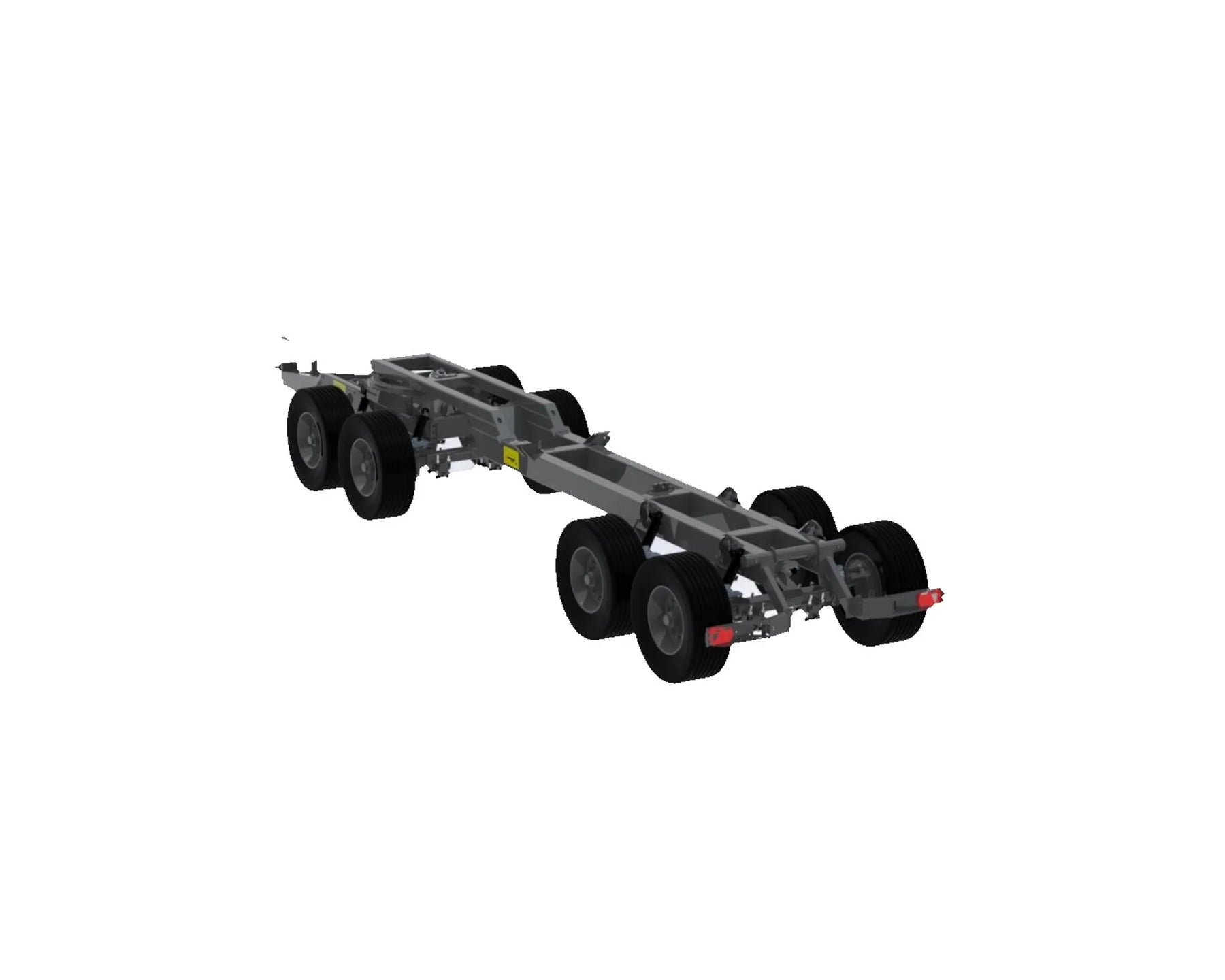 Item number chassis: 166713 Axles: one-piece axel body 120x120, Flange width 2 000 mm Load: 10,5 ton at 62 km/h, laser aligned Coated according KTL-method, black Axle distance 1 305mm, Axle system: Road Rim connection 280x335x10, domed nuts Communicating vessels: The chassis height is adjustable (from the chassis) 350mm Hydraulic brakes on all drums. Size 410x120. According VVFS 2003:20 Automatically adjusted brake arms AGS. Maximum hydraulic pressure 110 bar Cover sheets stop dirt entering the brake drums Back tipping, Tipping angle 52, Oil volume 45L/210 bars, Electrical system 12 Volt Lights according TSV LED 12-24V 7 pol. Prepared console for mounting different drawbars Colour Metsjö grey Chassis weight: 4 600 kg, Technical load: 42 000 kg, Payload 37 400 kg Surface treatment: chemical degreasing, blasting SA 2,5 The body is puttied. Painting according ISO 12944 A3.09. Colour system: Epoxy primer 2 x 70 µm. Top coat: Polyurethane 1 x 60 µm overall layer 200µm. Corrosion category C4 L