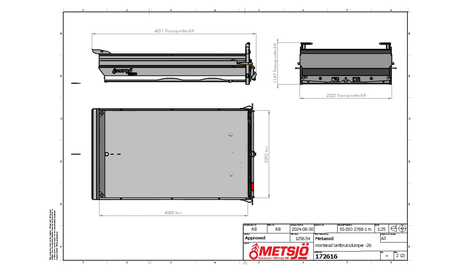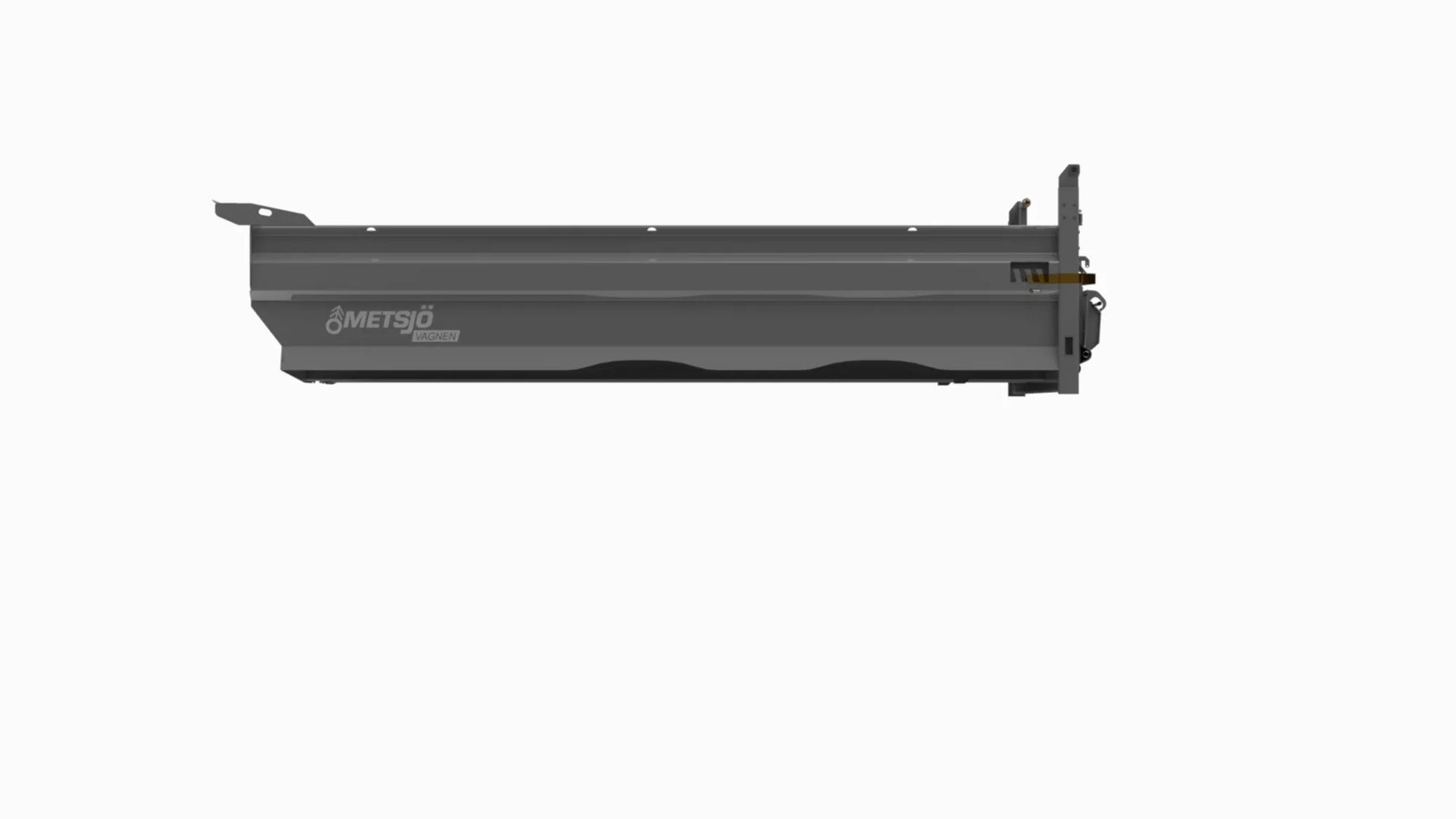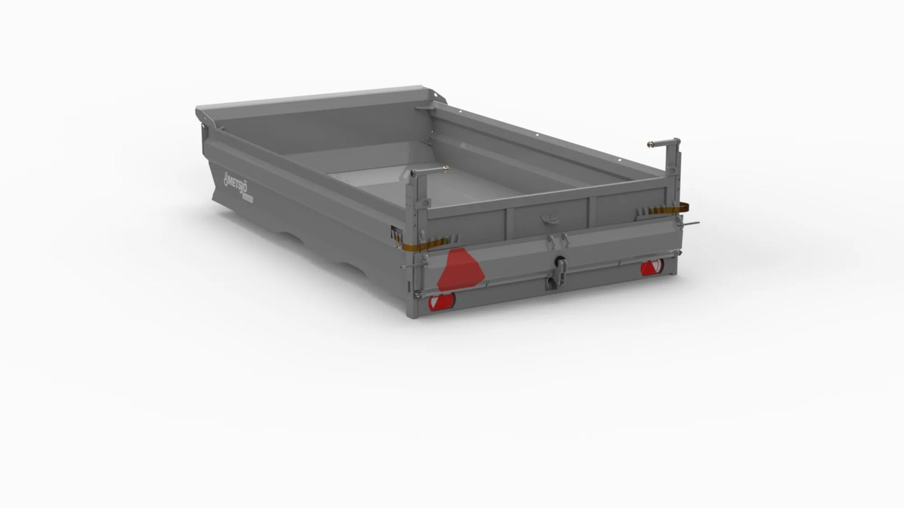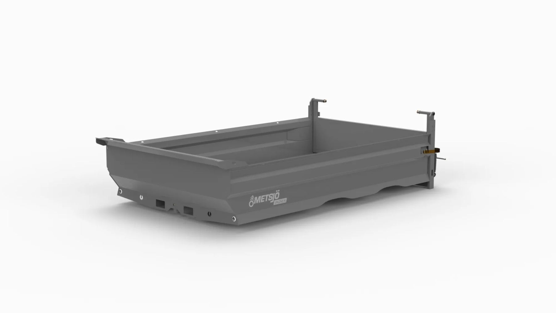 The bed sides are flanged 90" Heavy duty Steel 450 Brinell: Container bed 6 mm and sides 4 mm Purpose: Gravel Hydraulic pivoting earth and gravel tailgate H 300 mm Hooks for load securing 1,5 tons inside/outside Consols for mounting different tailgates Consols for mounting supporting legs on the containers Colour grey, painted according Metsjö standards Fits on MetaMid and MetaNo chassis Weight 1 250 kg