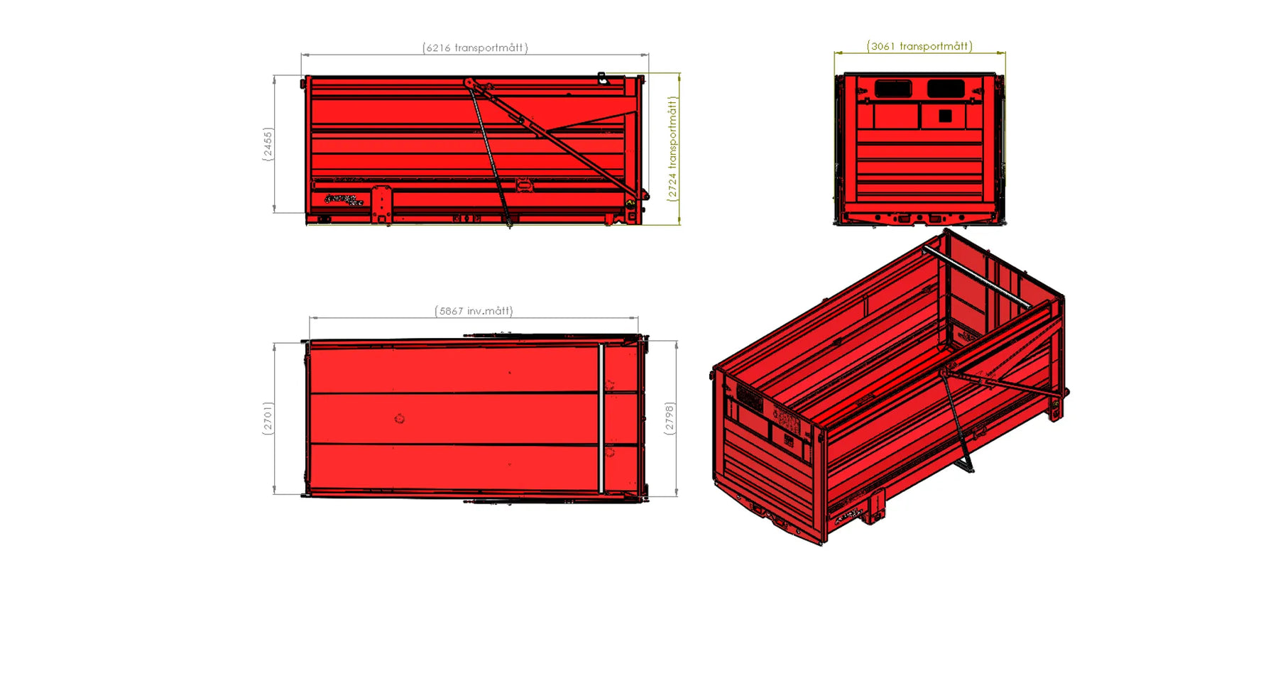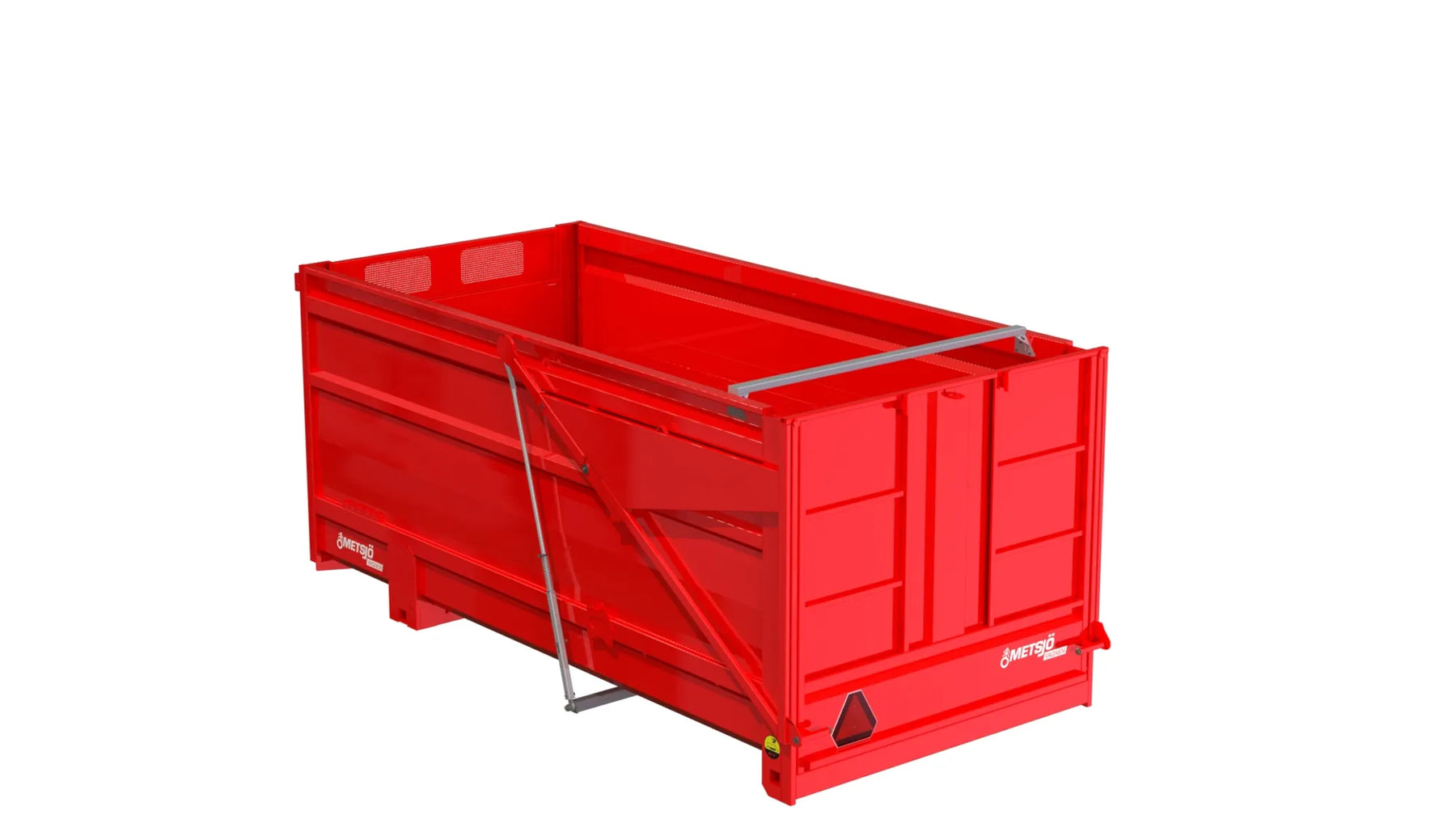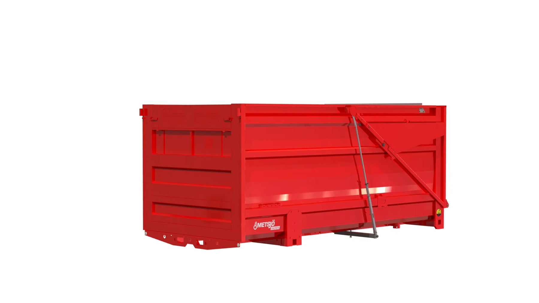 Heavy duty Steel 450 Brinell: Container bed 3,2 mm and sides 2 mm The bed sides are flanged 2x45" Automatic tailgate - opens automatically when the body is tipped The opening can be delayed Height = loading area 2 500mm (with tires diameter 1400 total H of the trailer is 4m) Conical body 100mm Standard without a roof Consols for mounting an extra sealing for the rear tailgate Consols for mounting a hydraulic tailgate Consols for mounting a roof/side extensions Consols for mounting supporting legs on the containers Colour red, painted according Metsjö standards Fits on MetaQ60 and Olympia 60 chassis Weight 2 300 kg