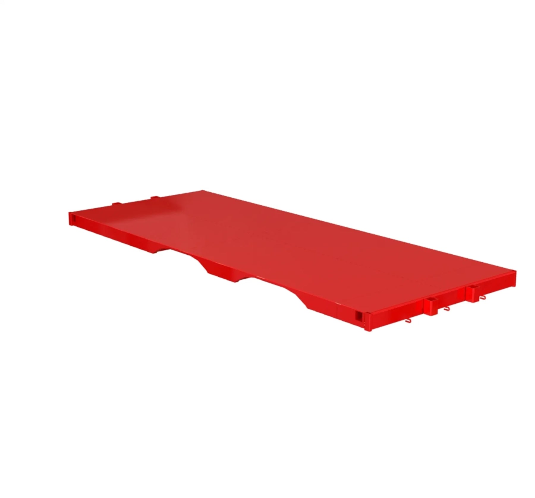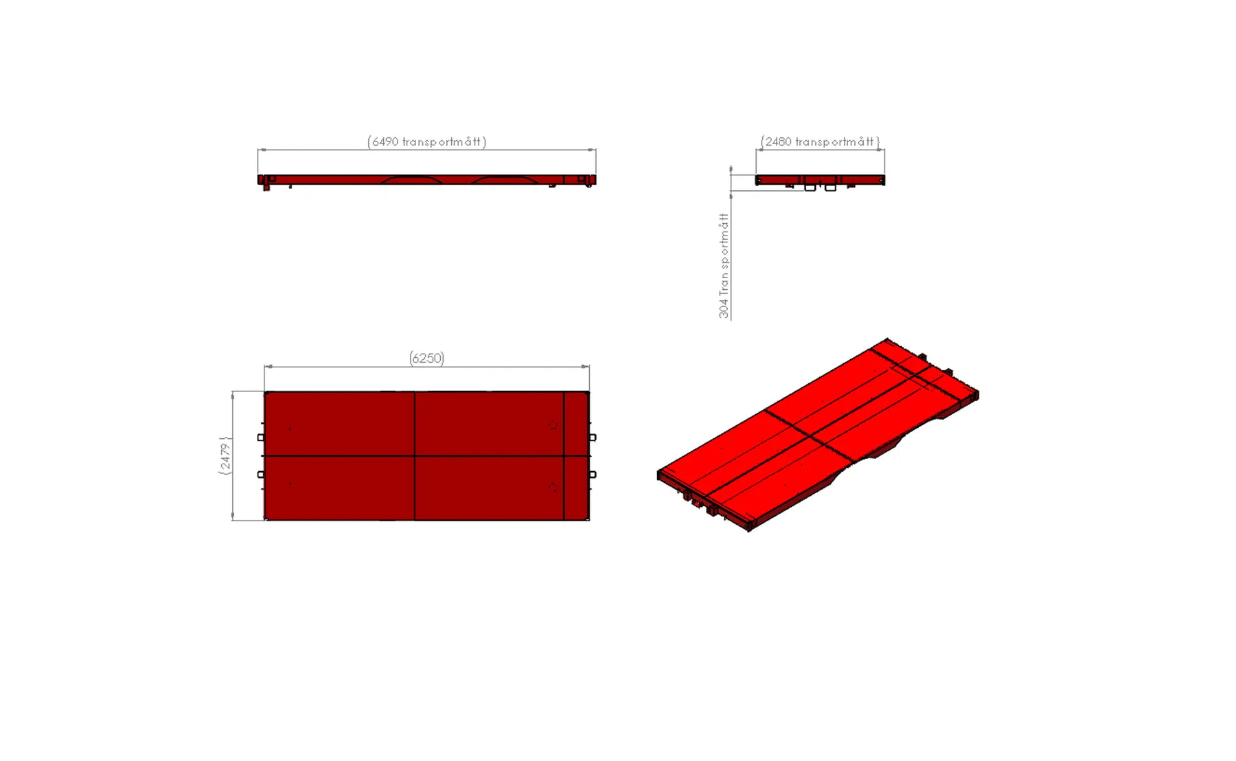 Steel 355 Brinell: Container bed 4 mm Distance from drawbar to platform 1 400mm Support weight 20% (support weight on standard tipping bodies 60%) While loading the goods, the driver must assure himself that the required support weight is available, so he can secure the load This platform cannot be used in a trailer combination (connected with a second trailer) This platform can be tipped Hooks for load securing - outside lining of the platform Consols for mounting different options for bale transport Consols for mounting supporting legs on the containers Colour red, painted according Metsjö standards Fits on MetaQ 60 and Olympia 60 chassis Weight 1320 kg