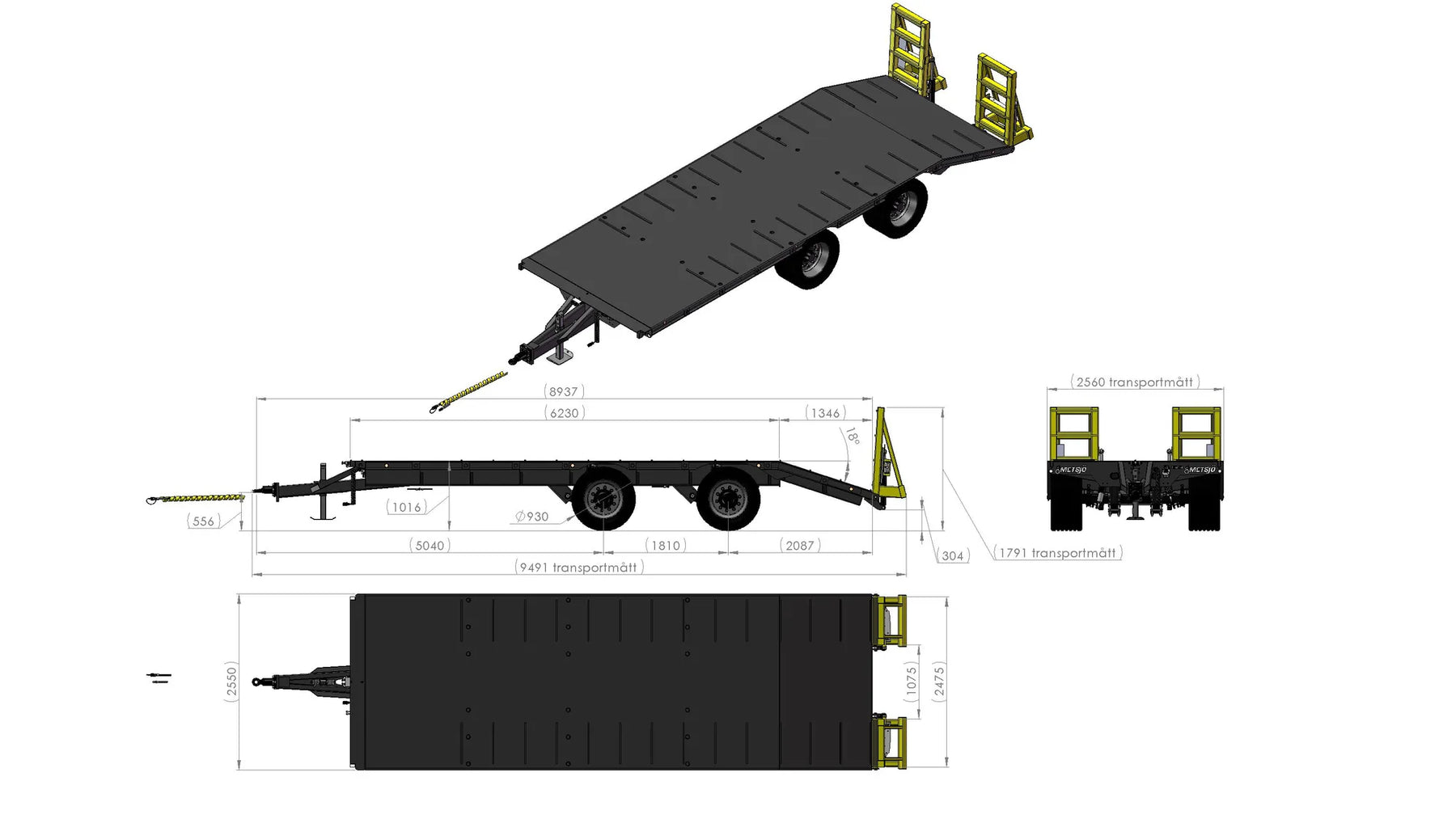Artikelnummer chassi: 103970 Slitplåt Brinell 450: Tjocklek Botten 6 mm. Plandel 6230mm, Vikramp 1350mm, Total 7580mm inkl vikramp Bindpunkter UTV flaklina Stackhylsor infällda Greppjärn för maskinband Flakplanet har en strukturerad yta för att minimera halkrisken Hjul 455/40x22,5 Diameter 930mm. Ramhöjd 1015mm. Axlar: Hel axelkropp 120x120, Avstånd över navflänsar 2 000 mm Belastning 10,5 ton vid 62 km. Laserriktade. Ytbehandlade enligt KTL- metoden, svart Avstånd mellan boggiaxlar cc 1810 mm. Axelupphängning "Road" Anslutning 280x335x10 kupolmutter Kommunicerande kärl: Hydrauliskt reglerbart chassi 350 mm vid chassit Bromsstorlek: 410x120. Hydrauliska bromsar på alla hjul - enligt VVFS 2003: 20, 5 Kap. 12 § Automatbromsarmar AGS. Max 110 bar hydraultryck. Skyddsplåt förhindrar smuts i trumma Hydraulik: Tvåsparks rundpump vid första tvärbit av chassit Parkbroms fastläge 1 EV (Höjd- och sidreglering komkärl centralblock HÖ/VÄ sida) 1 DV (Ramp) Belysning enligt TSV Diod 12/24 Volt 7 pol Fäste för valbart drag Färg Metsjö grå Chassivikt 4 470 kg Teknisk belastning: 24 000 kg Nyttolast 19 530 kg Ytbehandling: Förbehandling med alkalisk avfettning och blästring Sa 2,5 Karosseri kittas. Lackerat enl. ISO 12944 A3.09. Färgsystem: Epoxiprimer 2 x 70 µm. Täckfärg: Polyuretan 1 x 60 µm totalskikt ca. 200µm. Korrosivitetklass C4 L