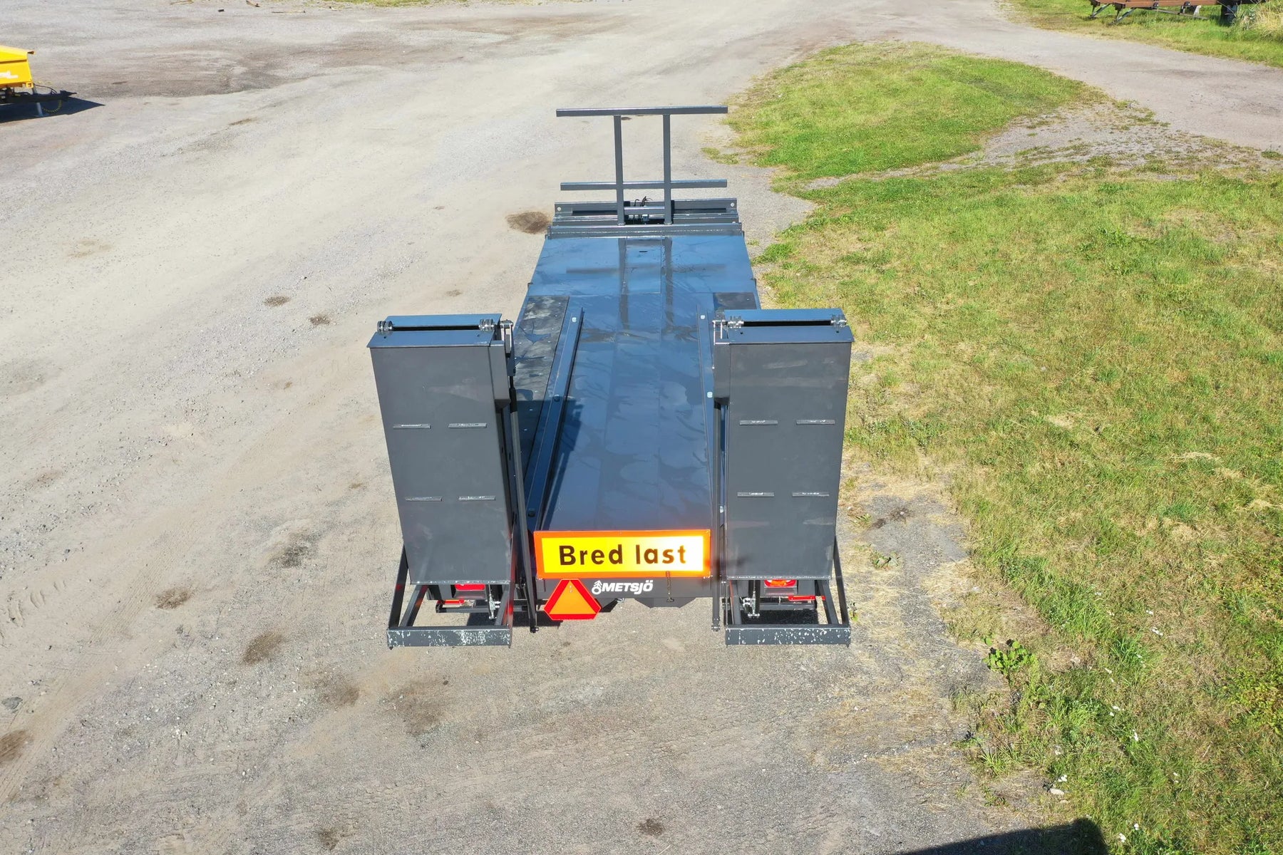 Artikelnummer chassi: 149373 Plåt Brinell 650: Tjocklek Botten 5 mm Redskapsbrunn Längd 1800mm Bredd 450mm Djup 250mm Bindpunkter UTV flaklina Flakplanet har en strukturerad yta för att minimera halkrisken Hjul 455/40x22,5 Diameter 930mm. Ramhöjd 995mm. Axlar: Hel axelkropp 120x120, Avstånd över navflänsar 2 000 mm Belastning 10,5 ton vid 62 km. Laserriktade. Ytbehandlade enligt KTL- metoden, svart Avstånd mellan boggiaxlar cc 1305 mm. Axelupphängning "Road" Anslutning 280x335x10 kupolmutter Kommunicerande kärl: Hydrauliskt reglerbart chassi 350 mm vid chassit Bromsstorlek: 410x120. Hydrauliska bromsar på alla hjul - enligt VVFS 2003: 20, 5 Kap. 12 § Automatbromsarmar AGS. Max 110 bar hydraultryck. Skyddsplåt förhindrar smuts i trumma Hydraulik: 1 EV (Höjd- och sidreglering komkärl centralblock HÖ/VÄ sida) Belysning enligt TSV Diod 12/24 Volt 7 pol Fäste för H-girndar, hydrauliska ramper Fäste för valbart drag Färg Metsjö grå Chassivikt 5 600 kg Teknisk belastning: 34 500 kg Nyttolast 28 900 kg Ytbehandling: Förbehandling med alkalisk avfettning och blästring Sa 2,5 Karosseri kittas. Lackerat enl. ISO 12944 A3.09. Färgsystem: Epoxiprimer 2 x 70 µm. Täckfärg: Polyuretan 1 x 60 µm totalskikt ca. 200µm. Korrosivitetklass C4 L
