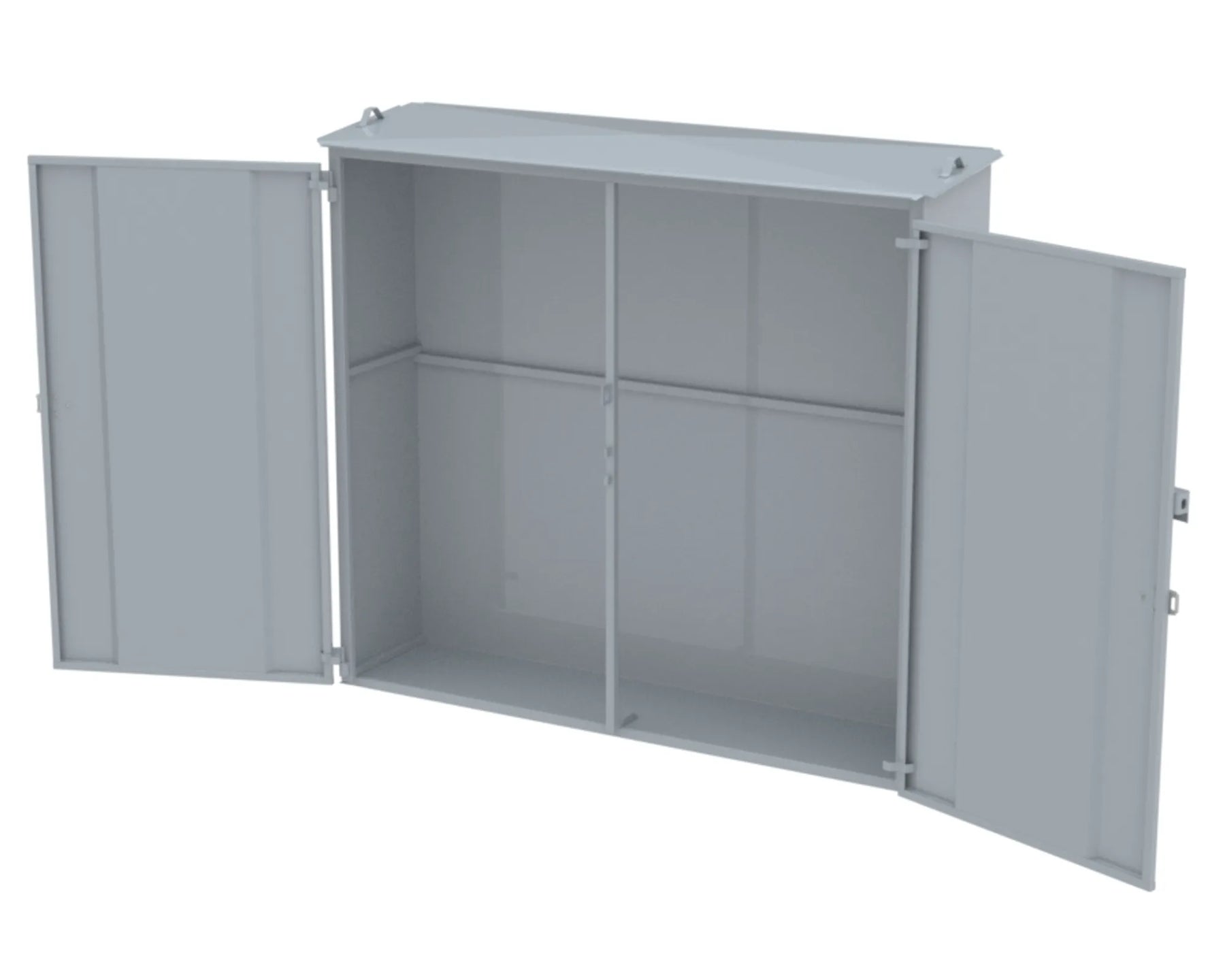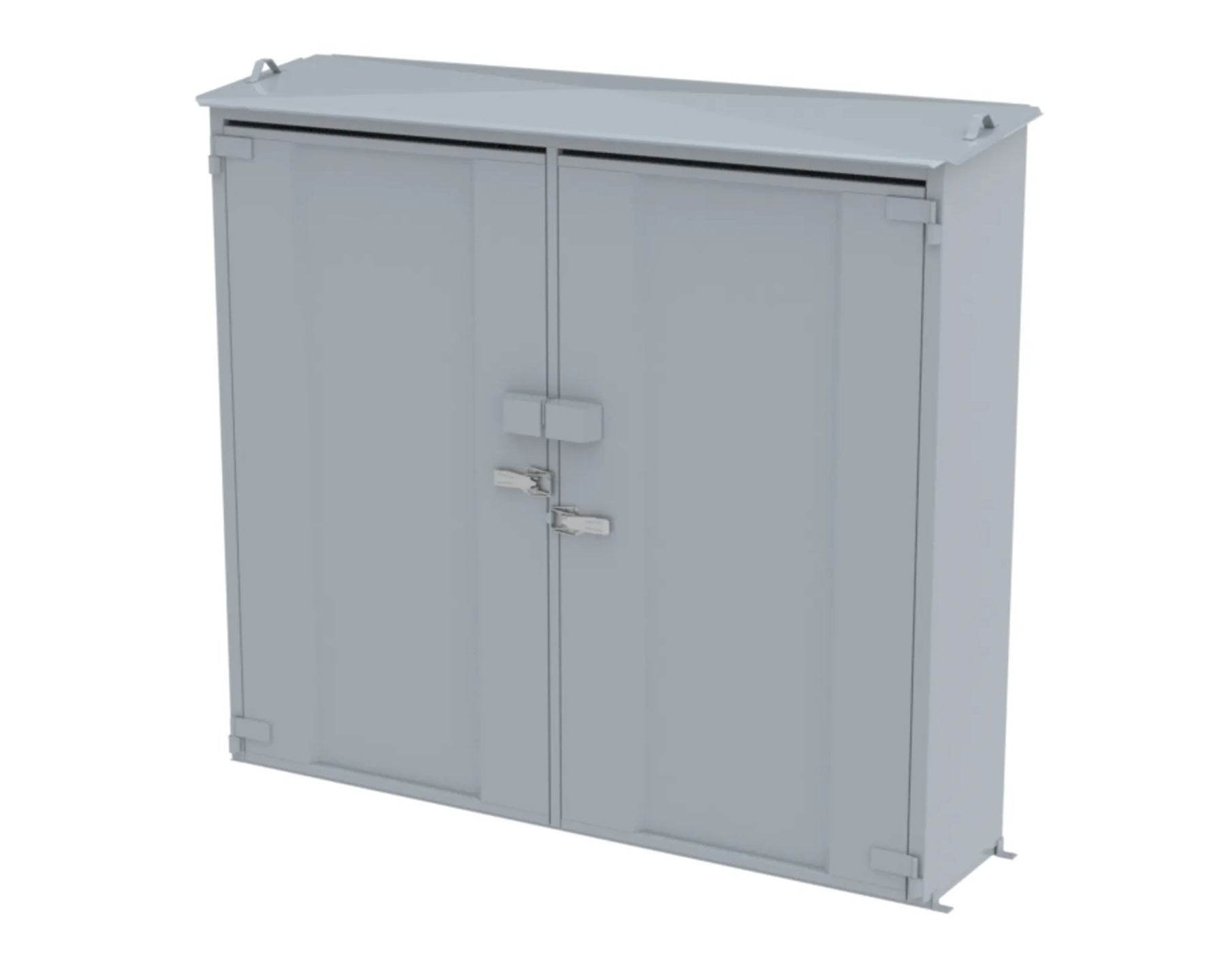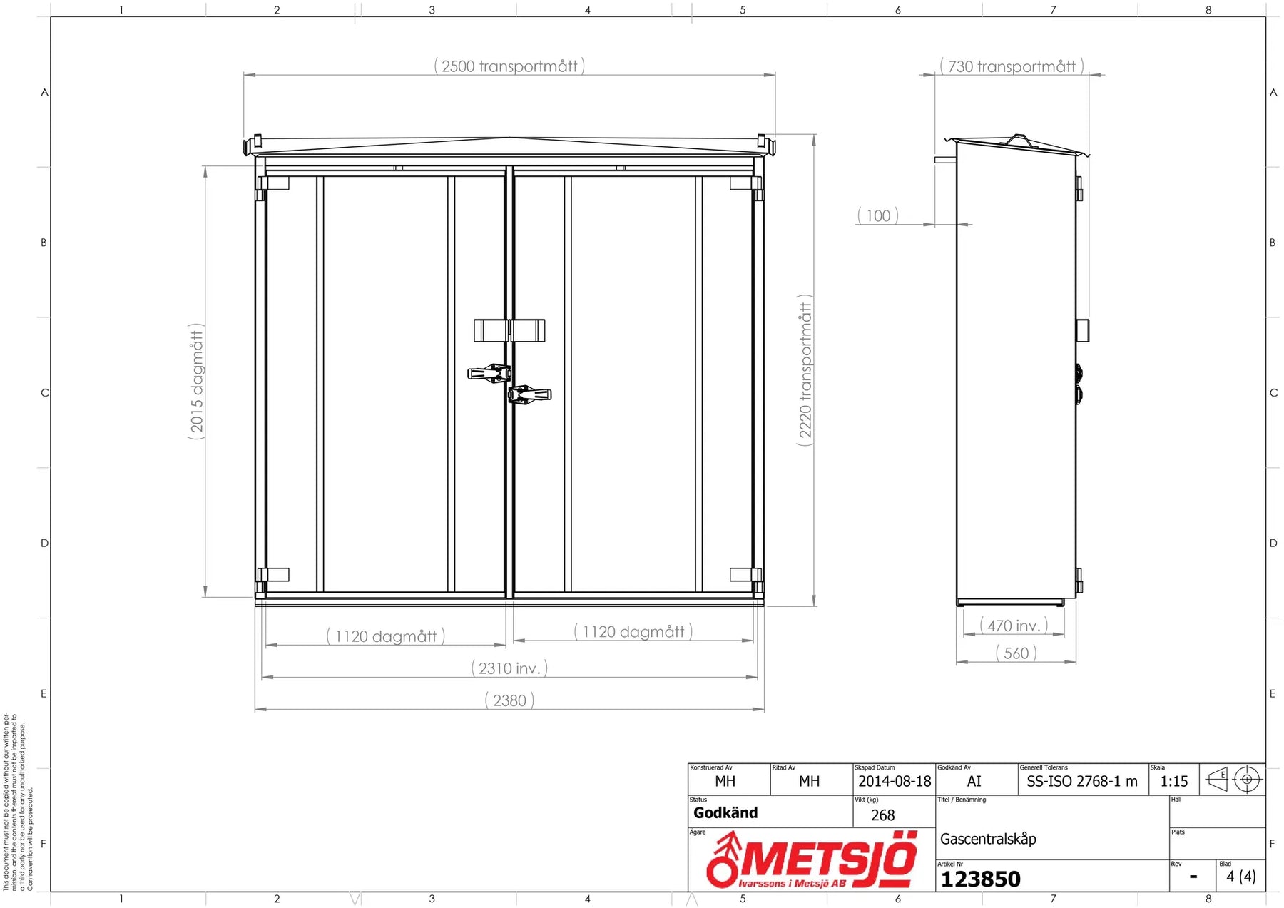 Invändigt mått B.H.D 2310x2075x470 mm. Transportmått B.H.D 2500x2220x730 mm. Konstruktion av 1,5 mm stålplåt intermittent svetsad. Vikt 275 kg. Godkänd försäkringsklass 2. Låses med 1 st snabblås samt hänglås (bygel 14-65). Dörröppning 180°, gångjärn med avhakningssäkring. Ventilation "självdrag" 1% av golvyta, över och under dörrblad. Takrila för vattenavledning åt höger och vänster sida. Invändgt placerad armaturbalk för montering av gasutrustning. Tippskydd (förankring i underlag). SKOTTGENOMGÅNG ELLER HÅLTAGNING ÄR TILLVAL OCH MÅSTE ANGES VID BESTÄLLNING OBS! Ytbehandling enligt ISO 12944: Förbehandling med alkalisk avfettning och blästring Sa 2,5 Kittning sker där konstruktion ej medger helsvetsning C4-Med. Totalskikt ca 200µm. Epoxi grundfärg, Polyuretan täckfärg ger 15 år Inv. skåp C3 enl. Metsjö standard. Bildar en yta som väl bibehåller glans och kulör samt är lätt att rengöra.