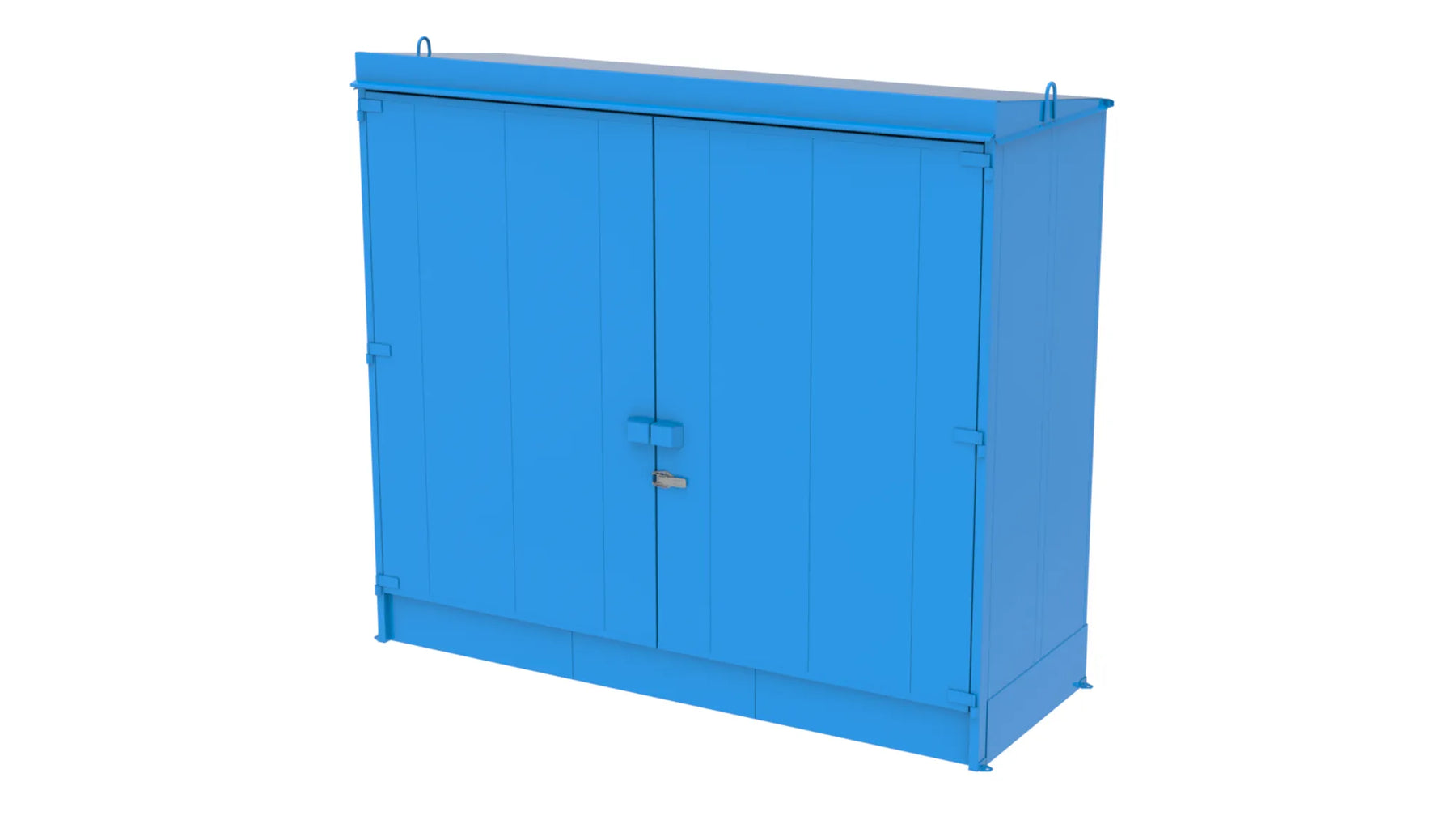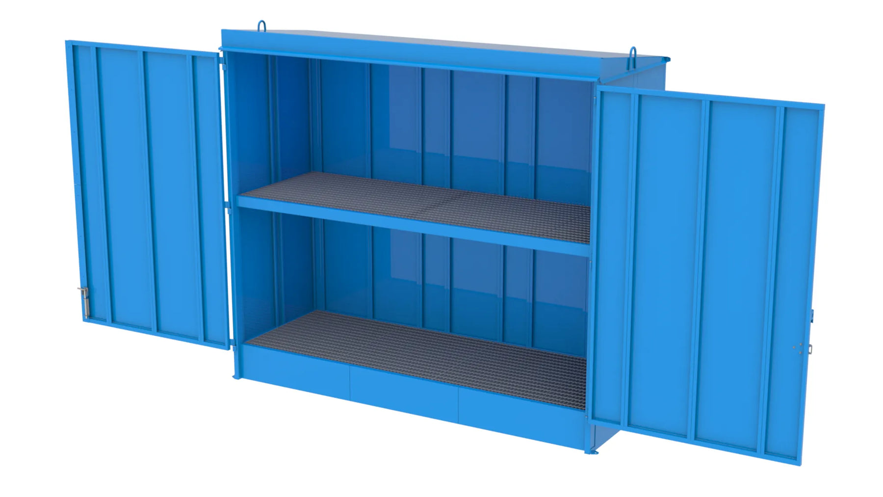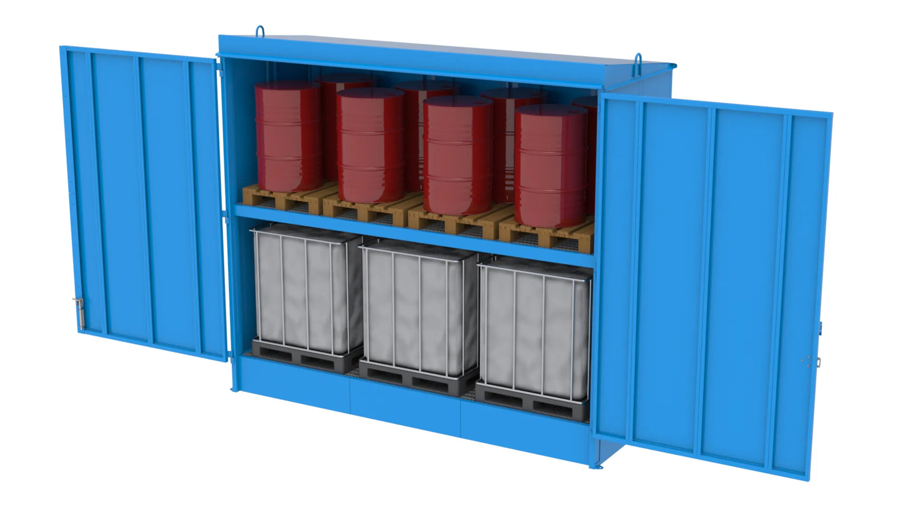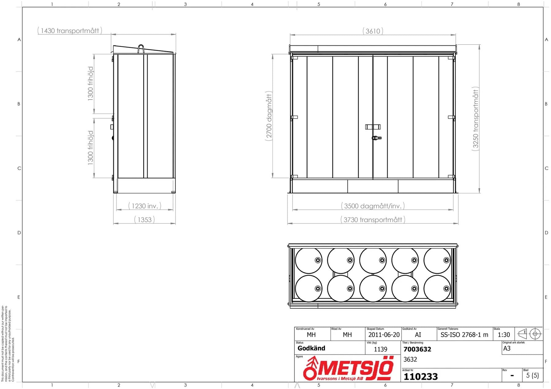 Invändigt mått B.H.D 3500x2700x1230 mm. Transportmått B.H.D 3730x3250x1430 mm. Fat 200 liters 8 stycken på europapallar (16 fat) eller. direkt på galler 20 st. IBC/cipax 6 st. Skåpets vikt 1500 kg. Spillbacken skall klara största kärlets volym + 10 % av resterande. 2 st hyllplan av gallerdurk, bärlast hyllplan 4500 kg. Första plan 330 mm andra plan 1730 mm. Frihöjd mellan plan 1300 mm. Konstruktion av 1,5 mm stålplåt intermittent svetsad. Godkänd försäkringsklass 2. Slagport. Låsbeslag snabblås + hänglåskåpa. Portblad med avhakningssäkring. Ventilationen är självdrag och 1% av golvytan under taksprång och under dörrblad. Ytbehandling enligt ISO 12944: Förbehandling med alkalisk avfettning och blästring Sa 2,5 Kittning sker där konstruktion ej medger helsvetsning C4-Med. Totalskikt ca 200µm. Epoxi grundfärg, Polyuretan täckfärg ger 15 år Inv. skåp C3 enl. Metsjö standard. Bildar en yta som väl bibehåller glans och kulör samt är lätt att rengöra.
