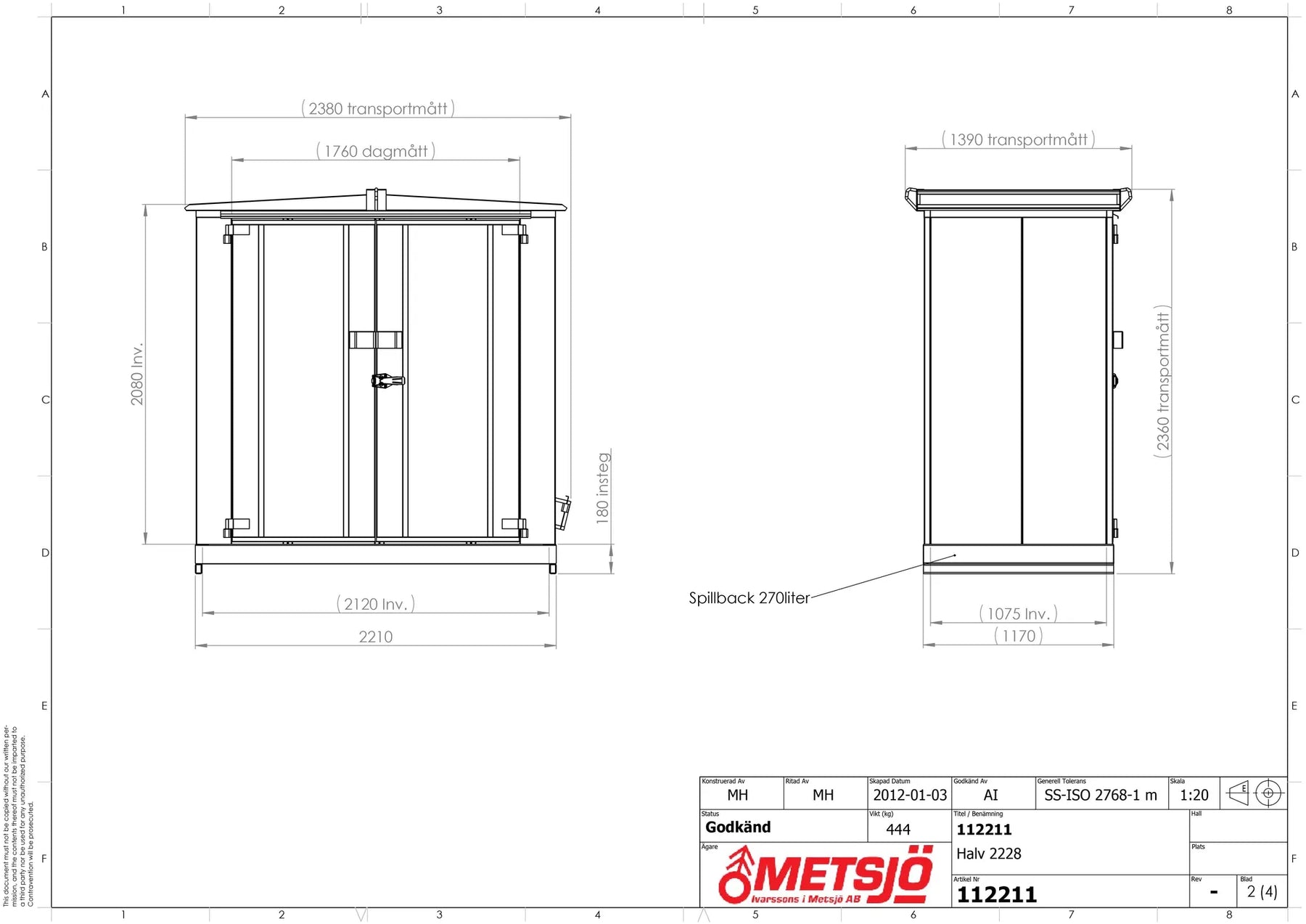Invändigt mått B.H.D 2120x2080x1075 mm. Transportmått B.H.D 2380x2360x1390 mm. 1 st golvplan av gallerdurk. Bärlast golvplan 1500kg. Tröskelhöjd 140 mm. Skåpets vikt 450 kg. Konstruktion av 1,5 mm stålplåt intermittent svetsad. Godkänd försäkringsklass 2. Slagport öppnas 180°. Låsbeslag snabblås + hänglåskåpa. Portblad med avhakningssäkring. Ventilation "självdrag" 1% av golvyta under taksprång och under dörrblad.Brandlucka (låsbar). Ytbehandling enligt ISO 12944: Förbehandling med alkalisk avfettning och blästring Sa 2,5 Kittning sker där konstruktion ej medger helsvetsning C4-Med. Totalskikt ca 200µm. Epoxi grundfärg, Polyuretan täckfärg ger 15 år Inv. skåp C3 enl. Metsjö standard. Bildar en yta som väl bibehåller glans och kulör samt är lätt att rengöra.