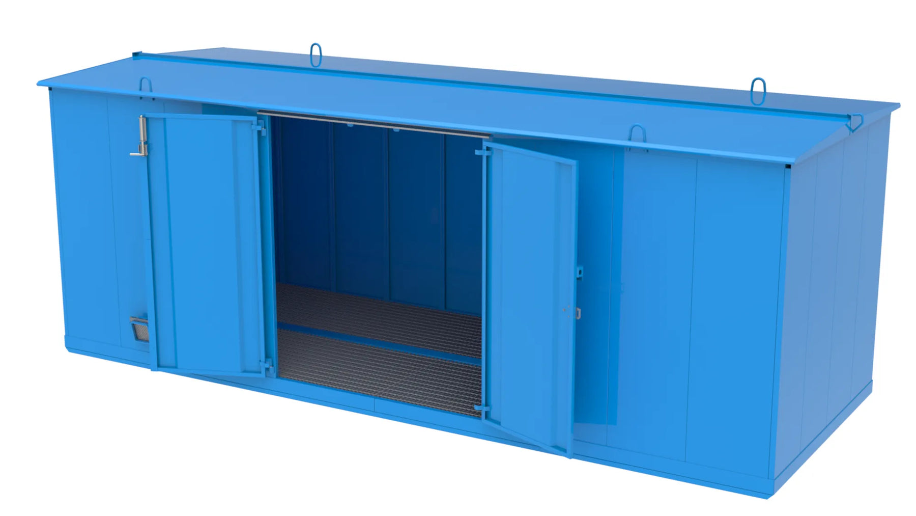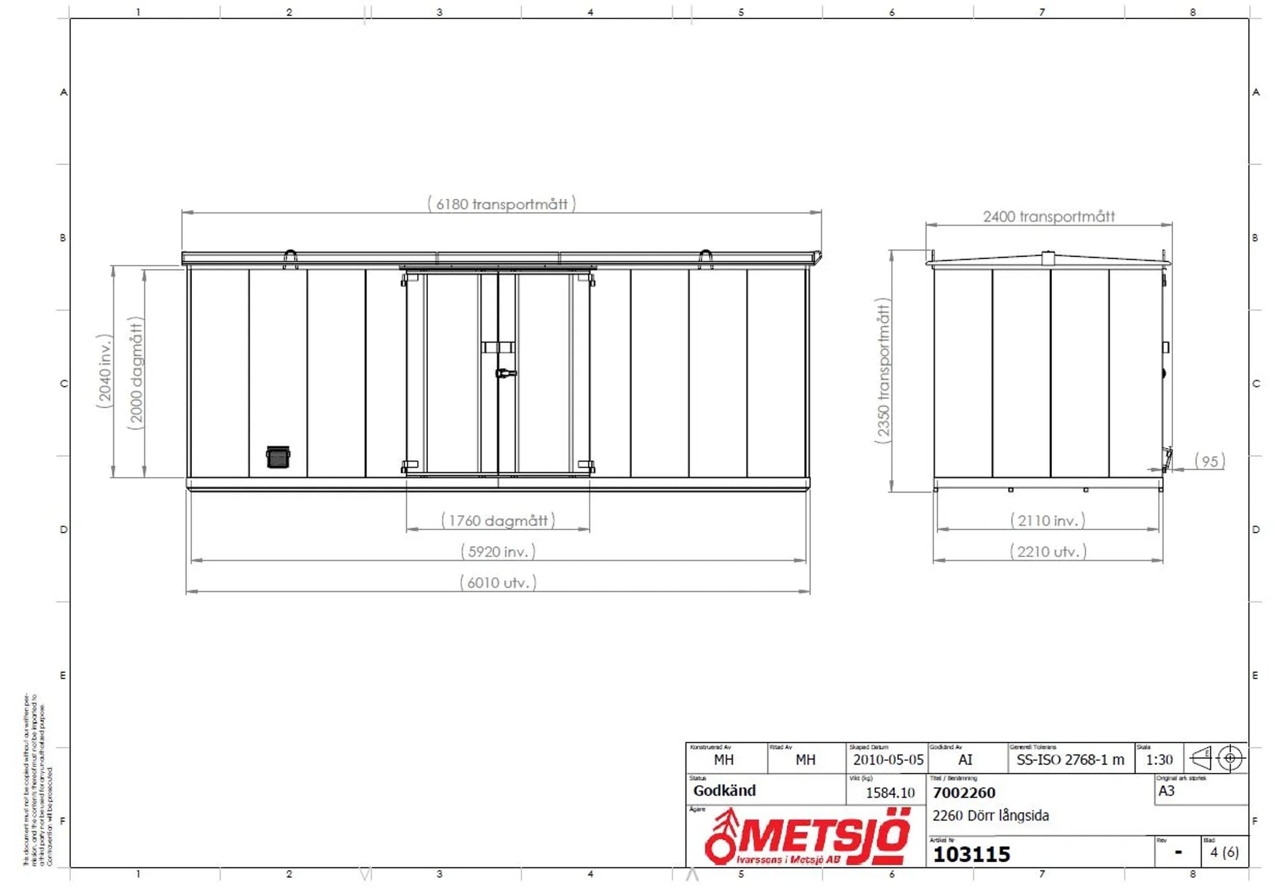 Invändigt mått B.H.D 5920x2040x2110 mm. Transportmått B.H.D 6180x2350x2400 mm. (Största kärlets volym + 10 % av resterande) 1 st golvplan av gallerdurk, bärlast 8000 kg. Tröskelhöjd 140 mm. Konstruktion av 1,5 mm stålplåt intermittent svetsad. Skåpets vikt 1600 kg Godkänd försäkringsklass 2 Slagport öppnas 120° Låsbeslag snabblås + hänglåskåpa Portblad med avhakningssäkring Ventilation "självdrag" 1% av golvyta under taksprång och under dörrblad Ytbehandling enligt ISO 12944: Förbehandling med alkalisk avfettning och blästring Sa 2,5 Kittning sker där konstruktion ej medger helsvetsning C4-Med. Totalskikt ca 200µm. Epoxi grundfärg, Polyuretan täckfärg ger 15 år Inv. skåp C3 enl. Metsjö standard. Bildar en yta som väl bibehåller glans och kulör samt är lätt att rengöra.