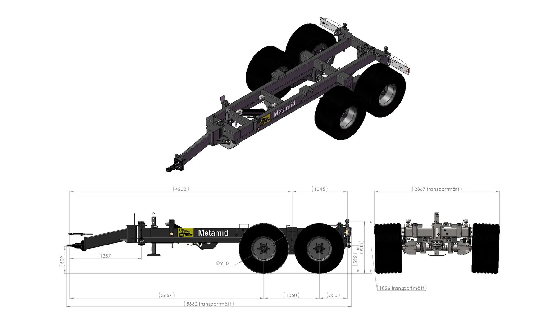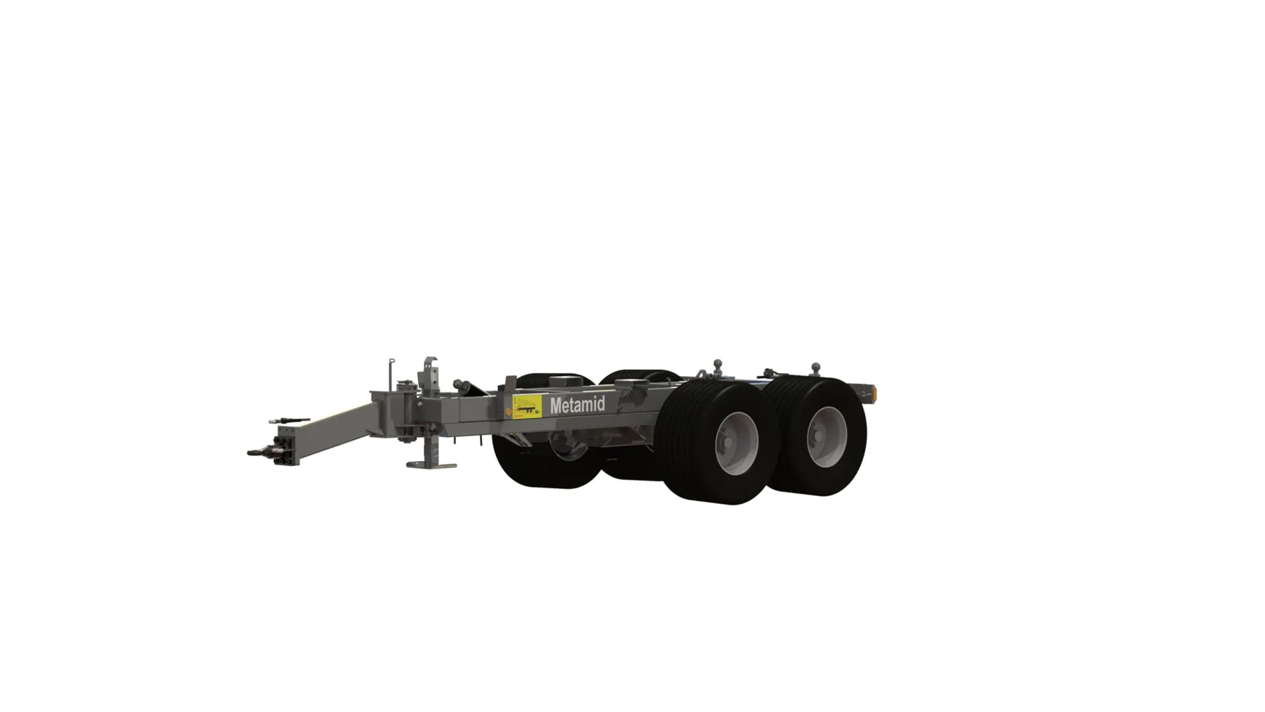 Artikelnummer chassi: 110133 Ramstyrningsled/Dragögla cc 1365mm Styrvinkel 40". Dubbelverkande funktion med hydraullås Pendelboggi cc 1050 mm, Max belastning 6 ton/axel Avstånd över navflänsar 1850 mm. Ytbehandlas enligt KTL- metoden, svart Anslutning 161 x 205 x 6 mutter öppen Bromsar: hydrauliska på alla hjul - enligt VVFS 2003: 20, 5 Kap. 12 § Manuellt justerbara bromsarmar Max 110 bar hydraultryck. Skyddsplåt förhindrar smuts i trumma Baktipp. Tippvinkel: 55º. Oljevolym 10L /210 bar Belysning enligt TSV Diod 12/24 Volt 7 pol Fäste för tillval boggilift Fäste för valbart drag Färg Metsjö grå Förberett för valfri påbyggnad MetaMid/MetaNo Chassivikt 1740 kg, Teknisk belastning 15 000 kg, Nyttolast 13 260 kg Ytbehandling: Förbehandling med alkalisk avfettning och blästring Sa 2,5 Karosseri kittas. Lackerat enl. ISO 12944 A3.09. Färgsystem: Epoxiprimer 2 x 70 µm. Täckfärg: Polyuretan 1 x 60 µm totalskikt ca. 200µm. Korrosivitetklass C4 L Kringutrustning: Hydrauluttag bak 1/2 flöde. per/st, 106643 Hydrauluttag bak Broms (olja) serie koppling, 106642 Bultbart bakdrag + eluttag 7 pol, 105366