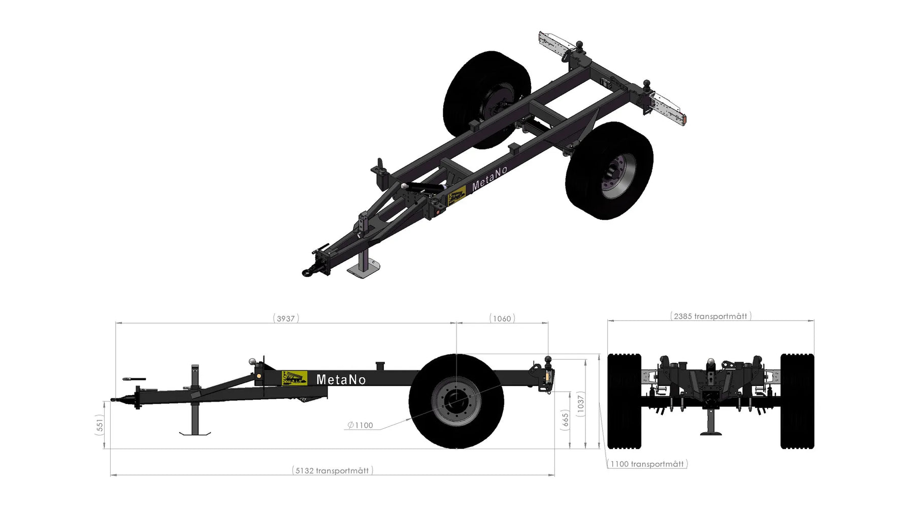 Artikelnummer chassi: 118140 Axlar: Hel axelkropp 120x120, Avstånd över navflänsar 2 000 mm Belastning 10,5 ton vid 62 km. Laserriktade. Ytbehandlade enligt KTL- metoden, svart Anslutning 280x335x10 kupolmutter Bromsstorlek: 410x120. Hydrauliska bromsar på alla hjul - enligt VVFS 2003: 20, 5 Kap. 12 § Automatbromsarmar AGS. Max 110 bar hydraultryck. Skyddsplåt förhindrar smuts i trumma Baktipp. Tippvinkel: 55º. Oljevolym 10L /210 bar Belysning enligt TSV Diod 12/24 Volt 7 pol Fäste för valbart drag Färg Metsjö grå Förberett för valfri påbyggnad MetaMid/MetaNo Chassi vikt 1100kg, Teknisk belastning 13 000 kg, Nyttolast 11 900 kg Ytbehandling: Förbehandling med alkalisk avfettning och blästring Sa 2,5 Karosseri kittas. Lackerat enl. ISO 12944 A3.09. Färgsystem: Epoxiprimer 2 x 70 µm. Täckfärg: Polyuretan 1 x 60 µm totalskikt ca. 200µm. Korrosivitetklass C4 L