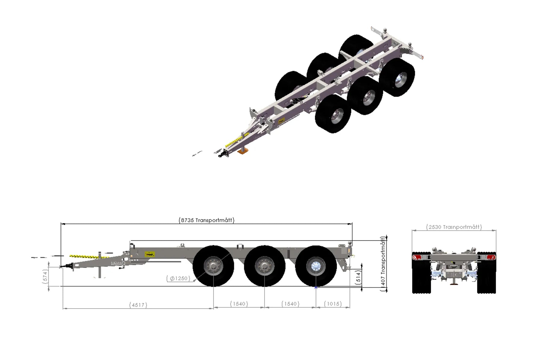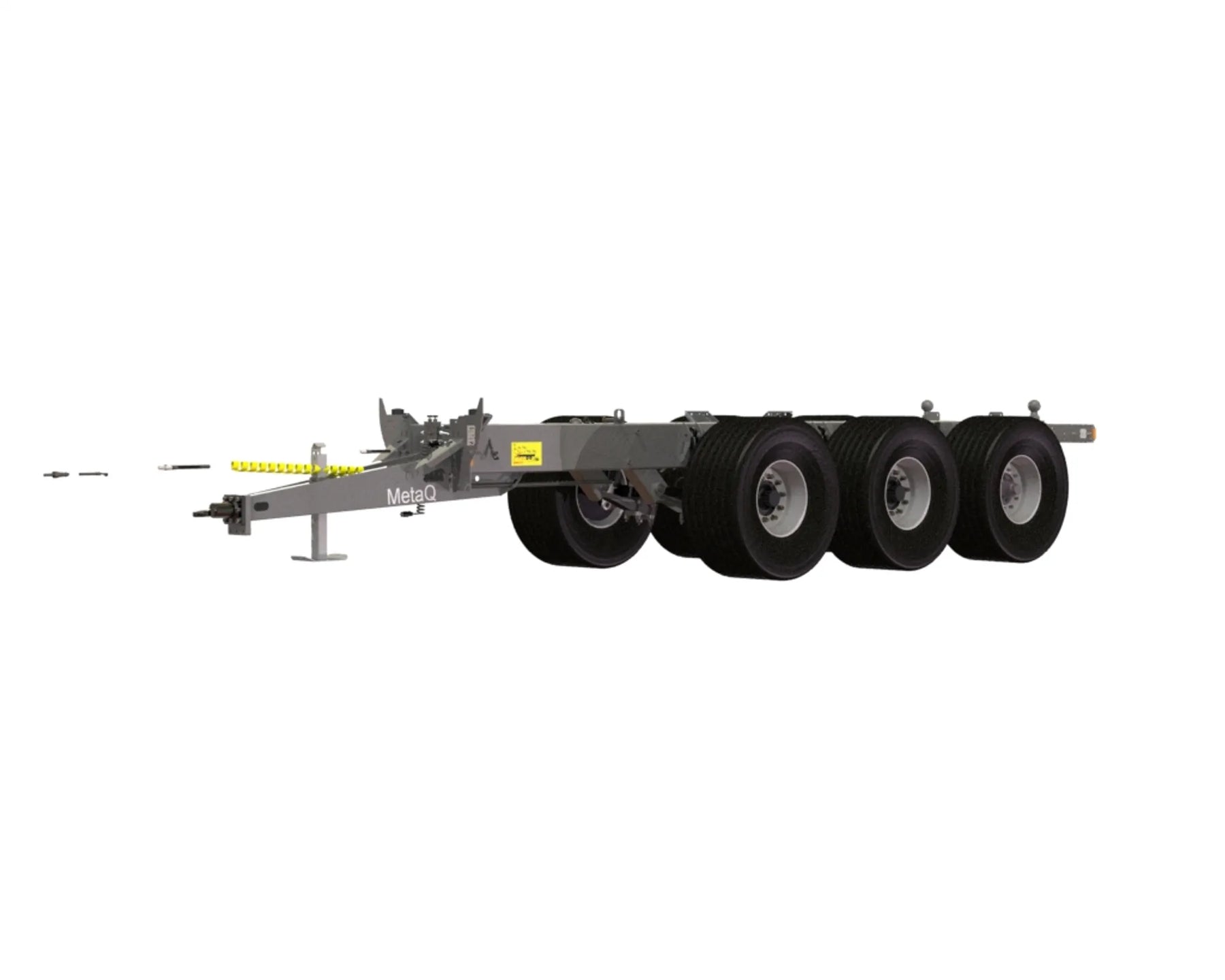 Artikelnummer chassi: 110188 Axlar: Hel axelkropp 120x120, Avstånd över navflänsar 2 000 mm Belastning 10,5 ton vid 62 km. Laserriktade. Ytbehandlade enligt KTL- metoden, svart Avstånd mellan boggiaxlar cc 1540 mm. Axelupphängning "Road" Medspårande axel med hydraulisk låsning vid backning (axel 3) Anslutning 280x335x10 kupolmutter Kommunicerande kärl: Hydrauliskt reglerbart chassi 350 mm vid chassit Bromsstorlek: 410x120. Hydrauliska bromsar på alla hjul - enligt VVFS 2003: 20, 5 Kap. 12 § Automatbromsarmar AGS. Max 110 bar hydraultryck. Skyddsplåt förhindrar smuts i trumma Baktipp. Tippvinkel: 52º. Oljevolym 45L/210 bar. Elsystem 12 Volt Belysning enligt TSV Diod 12/24 Volt 7 pol Automatlämsfäste Fäste för valbart drag Färg Metsjö grå Förberett för valfri påbyggnad MetaQ75 Chassivikt 4 300 kg Teknisk belastning: 34 500 kg, Nyttolast 30 200 kg Ytbehandling: Förbehandling med alkalisk avfettning och blästring Sa 2,5 Karosseri kittas. Lackerat enl. ISO 12944 A3.09. Färgsystem: Epoxiprimer 2 x 70 µm. Täckfärg: Polyuretan 1 x 60 µm totalskikt ca. 200µm. Korrosivitetklass C4 L Kringutrustning: Hydrauluttag bak 1/2 flöde. per/st, 106643 Hydrauluttag bak Broms (olja) serie koppling, 106642 Bultbart bakdrag + eluttag 7 pol, 105366