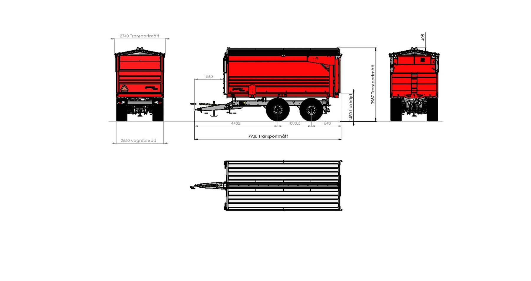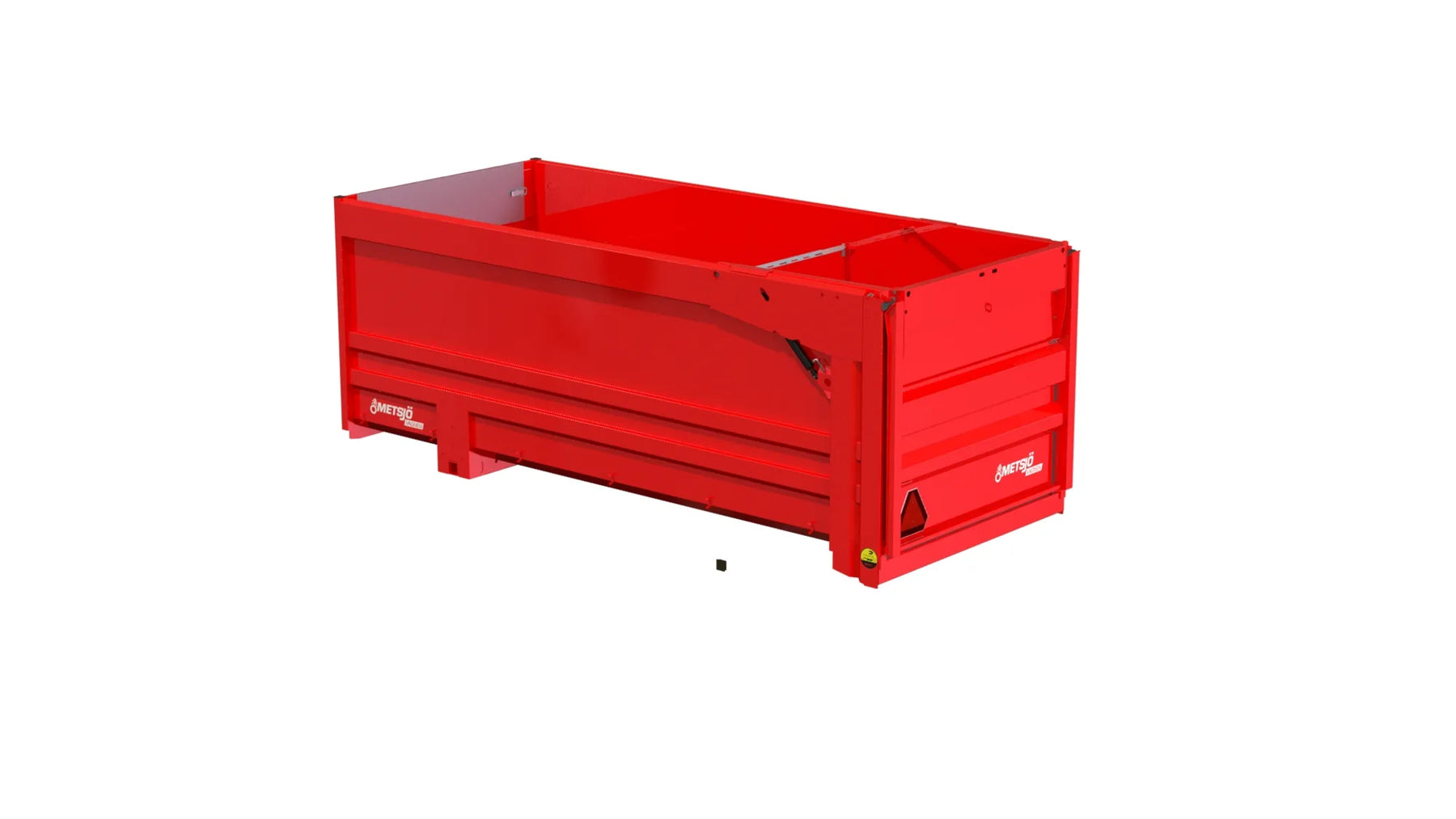 Slitplåt Brinell 450: Tjocklek Botten 3,2 mm, Sida 2 mm Bakläm: Hydraulisk högöppnande 130" H2100. Dropptät Siktläm i framstam 500x2000 perforering inkl. täckplåt Bindningspunkter utsida Fästen för redskapsbytarben Lackas Metsjö Röd, karosseri kittas enligt Metsjö standard För MetaQ 60 chassi Vikt 2360 kg