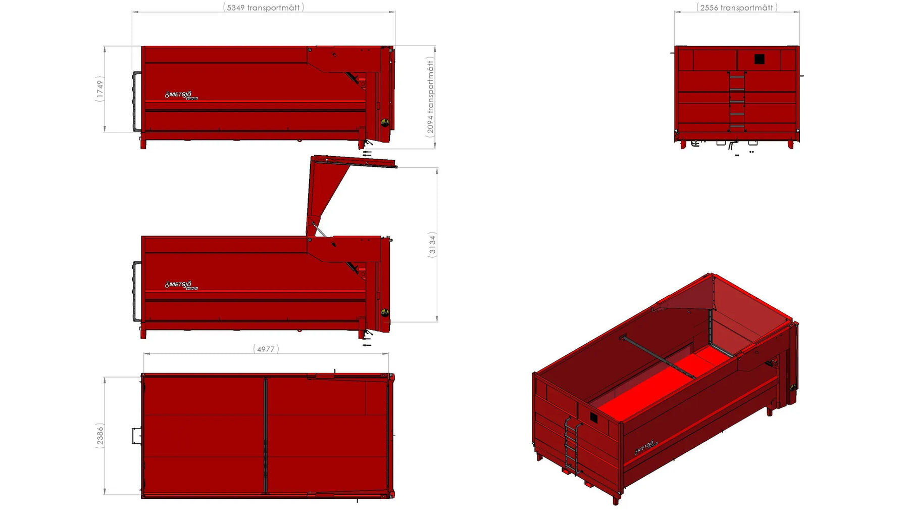 Slitplåt Brinell 450: Tjocklek Botten 3,2 mm, Sida 2 mm Bakläm: Hydraulisk högöppnande 130" H1750. Dropptät Siktläm i framstam 500x2000 perforering inkl. täckplåt Höger sida: Hydraulisk schaktläm H300. Övere delen: fast Skiftarventil: bakläm/sidläm manuel 6-2 ventil placerad vid vältaxeln. Bindningspunkter utsida Fästen för redskapsbytarben Lackas Metsjö Röd, karosseri kittas enligt Metsjö standard Vikt 2270kg .. Beakta att trevägstipp är inget Flak bytare system Till gång till chassi krävs. För fullgod leverans.