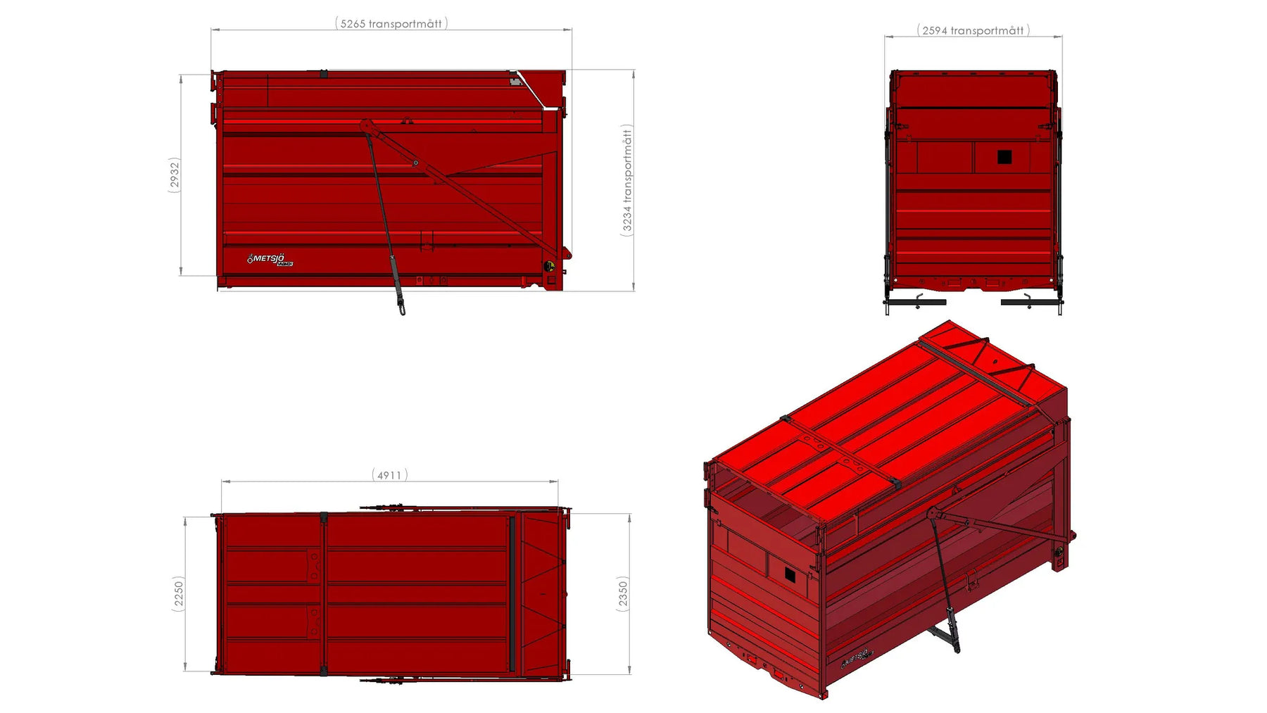 Slitplåt Brinell 450: Tjocklek Botten 3,2 mm, Sida 2mm Övergång Sida/flak 2x45" Bakläm: Automatläm - öppnas när man tippar flaket Möjlighet att välja, med eller utan fördröjning Demonterbar framstams överedel 450mm Höjd flak + läm= lastarea 3000mm (vid hjulval dia 1400mm total H4500mm) Koniskt flak 100mm Standard med tak Fästen för tillval tätnings kitt för spannmåls transport Fästen för tillval hydraulisk öppning bakläm Fästen för tak/raksarg Fästen för redskapsbytarben Lackas Metsjö Röd, karosseri kittas enligt Metsjö standard För MetaX / Olympia 50 chassi Vikt 2300kg Kringutrustning: Framstam, 124625-Röd