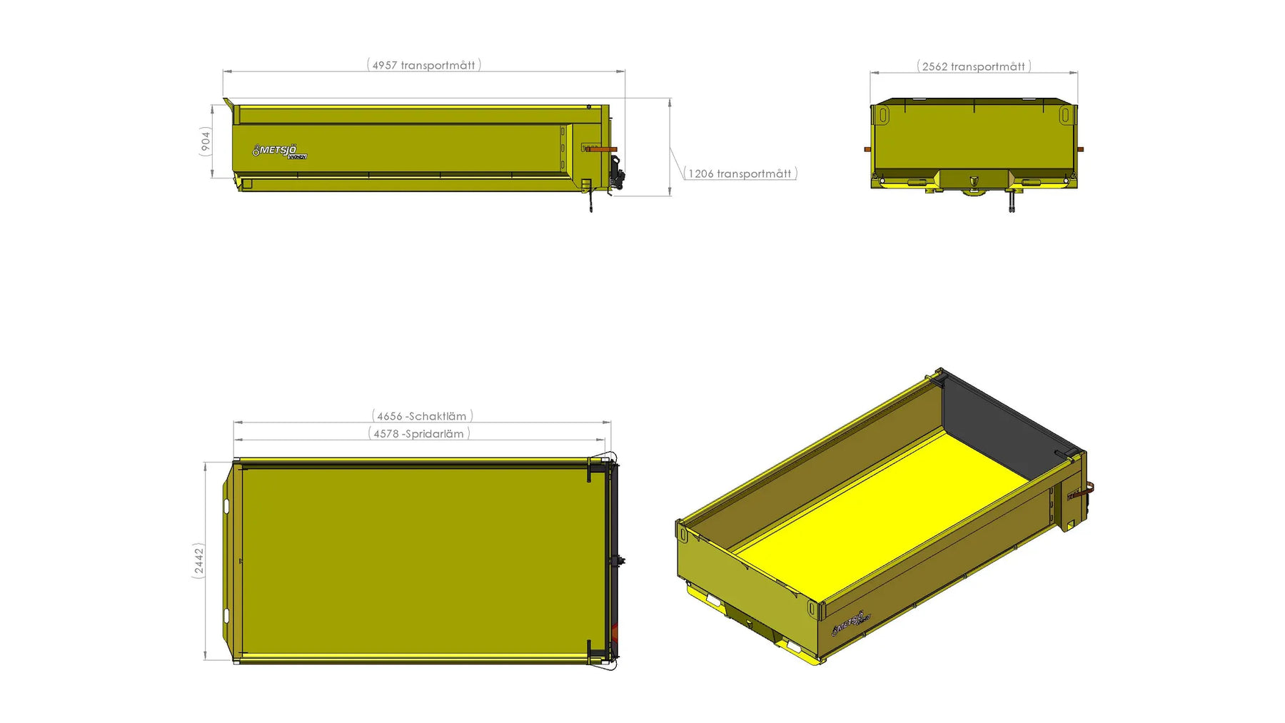 6.1 Övergång Sida/flak 3x30" Slitplåt Brinell 450: Tjocklek Botten 6 mm, Sida 4 mm, Syfte Grus Bakläm: Hydraulisk schaktläm höjd 300 mm, Hydraullås Bindningspunkter utsida / Surrningsdon invändigt Fäste för tillval spridarläm/band Fäste för tillval spannmålskitt Fästen för redskapsbytarben Lackas Metsjö Gul, karosseri kittas enligt Metsjö standard För MetaX / Olympia 50 chassi Vikt 1740 kg Kringutrustning: Topphängd spridarläm H900 höglyft, 120874