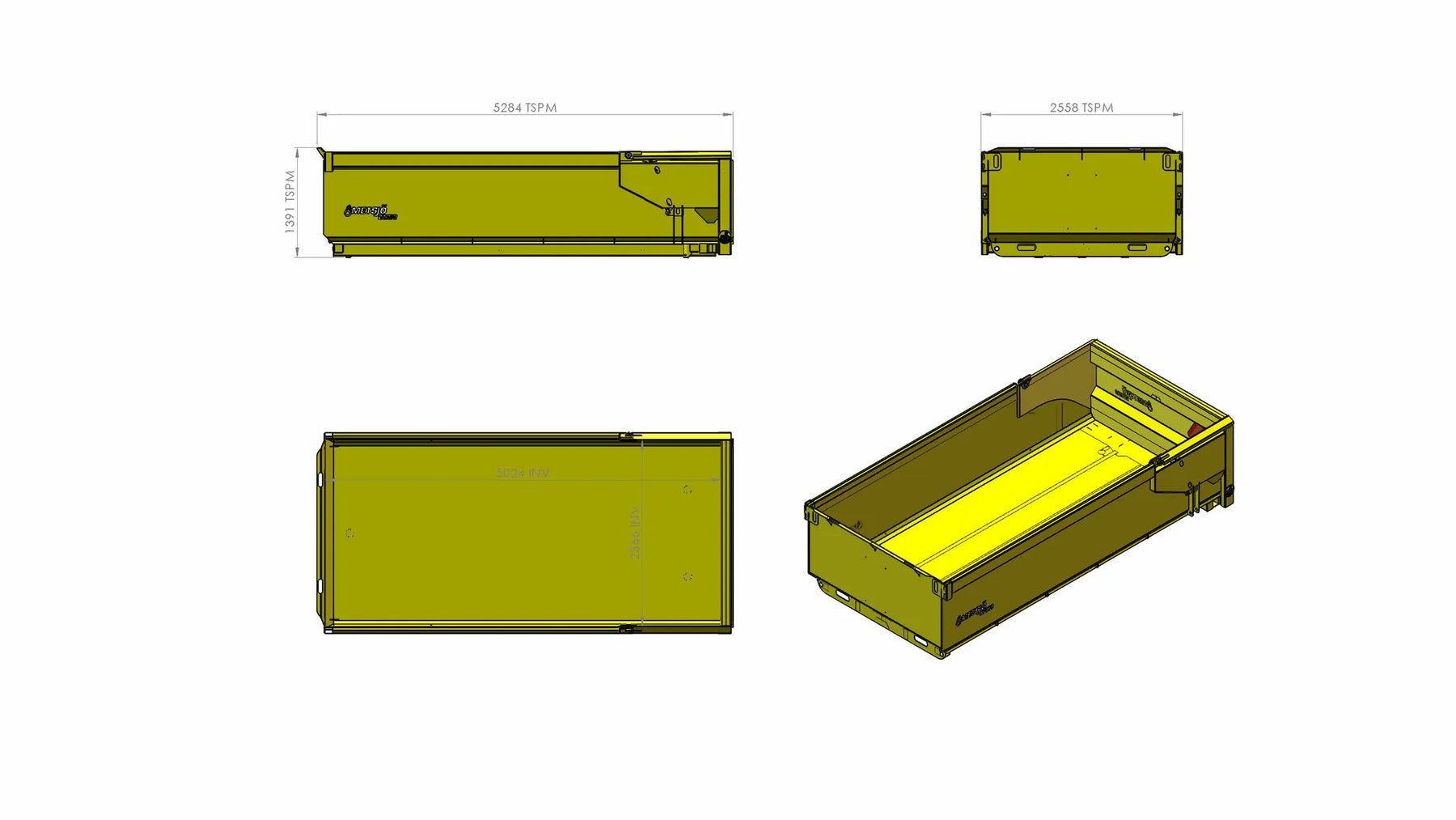 6.1 Övergång Sida/flak 3x30" Slitplåt Brinell 450: Tjocklek Botten 6 mm, Sida 6 mm, Syfte Grus Bakläm: Hydraulisk schaktläm höglyftande H1150. Hydraullås Bindningspunkter utsida / Surrningsdon invändigt Fästen för redskapsbytarben Lackas Metsjö Gul, karosseri kittas enligt Metsjö standard För MetaX / Olympia 50 chassi Vikt 2285 kg