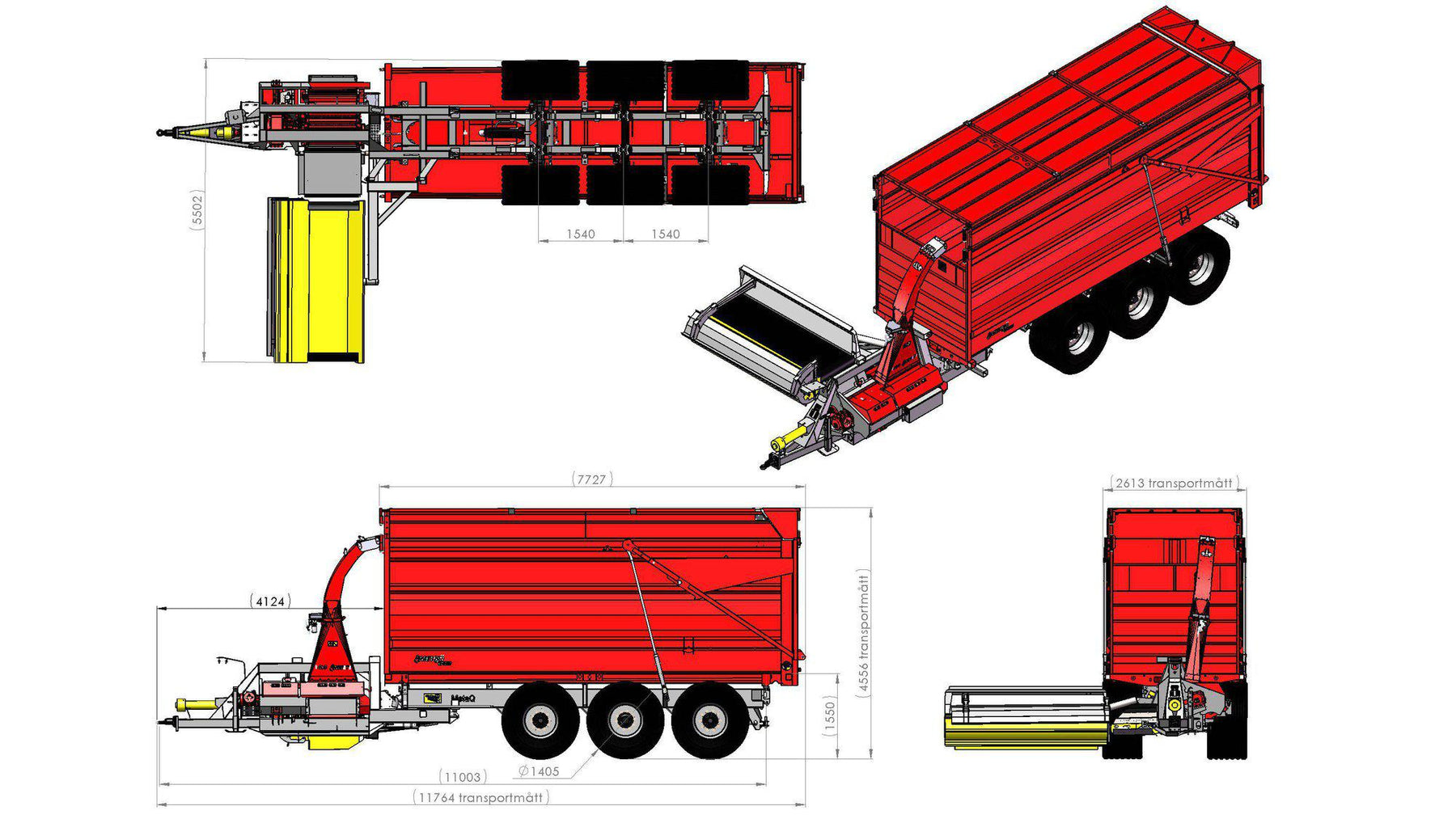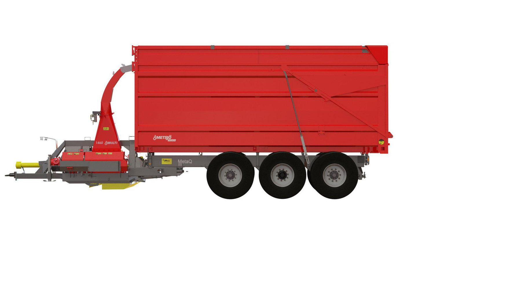 Artikelnummer komplett: 133193 Axlar: Hel axelkropp 120x120, Avstånd över navflänsar 2 000 mm Belastning 10,5 ton vid 62 km. Laserriktade. Ytbehandlade enligt KTL- metoden, svart Avstånd mellan boggiaxlar cc 1540 mm. Axelupphängning "Road" Medspårande axel med hydraulisk låsning vid backning (axel 1 och 3) Anslutning 280x335x10 kupolmutter Kommunicerande kärl: Hydrauliskt reglerbart chassi 350 mm vid chassit Bromsstorlek: 410x120. Hydrauliska bromsar på alla hjul - enligt VVFS 2003: 20, 5 Kap. 12 § Automatbromsarmar AGS. Max 110 bar hydraultryck. Skyddsplåt förhindrar smuts i trumma Baktipp. Tippvinkel: 52º. Oljevolym 45L/210 bar. Elsystem 12 Volt Belysning enligt TSV Diod 12/24 Volt 7 pol Automatlämsfäste Fäste för valbart drag Färg Metsjö grå Förberett för valfri påbyggnad MetaQ75 Chassivikt 4 600 kg Teknisk belastning: 34 500 kg Artikelnummer flak: 124829 GF-flak+sarg+tak MQ75 L7500 H3000 B2550 52kbm Slitplåt Brinell 450: Tjocklek Botten 3,2 mm, Sida 2mm Övergång Sida/flak 2x45" Bakläm: Automatläm - öppnas när man tippar flaket Möjlighet att välja, med eller utan fördröjning Demonterbar framstams överedel 450mm Höjd flak + läm= lastarea 3000mm (vid hjulval dia 1400mm total H4500mm) Koniskt flak 100mm Standard med tak Fästen för tillval tätnings kitt för spannmåls transport Fästen för tillval hydraulisk öppning bakläm Fästen för tak/raksarg Fästen för redskapsbytarben Lackas Metsjö Röd, karosseri kittas enligt Metsjö standard För MetaQ 75 / Olympia 75 chassi Vikt 3060 kg Artikelnummer hack 1460: 126730 Hack Kongskilde 1460 Metaldetektor Direktdriven med vidvinkel PTO. 20 bommad grov 1"3/4 Multifäste med fäste för garage hjul Rekommenderad traktor stolek 280 HK Pickup bredd 3000mm. ROC bandriven Pickupp på boggihjul: hydrauliskt upphängd Pickup bord kan lyftas under gång Pickup hydraulsikt vikbar, transport bredd 2550mm höjd 4000mm Går att hydrauliskt vända om körriktlinjen. Ställbar hastighet på fingrarna. Mattarband/fingrar körs direkt mot traktorn: hydrauliskt ½ flöde Hydraulfunktioner: El-hydraulik (Pickup uppfäll - Utkast rör) Bultad hitchögla Vikt 2900 kg Vagns vikt 10850 kg, Nyttolast 23 650 kg Ytbehandling: Förbehandling med alkalisk avfettning och blästring Sa 2,5 Karosseri kittas. Lackerat enl. ISO 12944 A3.09. Färgsystem: Epoxiprimer 2 x 70 µm. Täckfärg: Polyuretan 1 x 60 µm totalskikt ca. 200µm. Korrosivitetklass C4 L Kringutrustning: Bultbart bakdrag + eluttag 7 pol, 105366 Medspårande axel 1 och 3