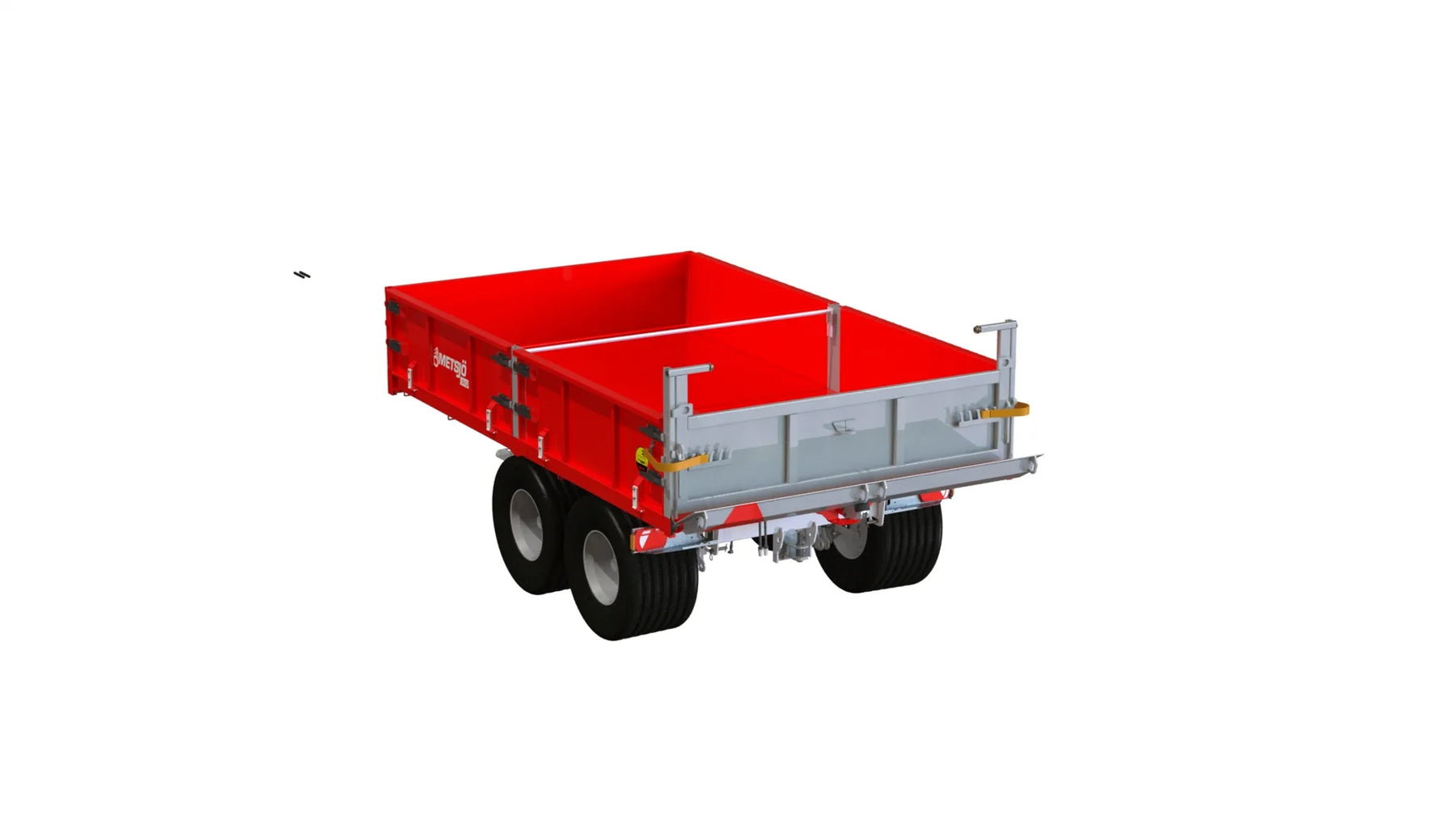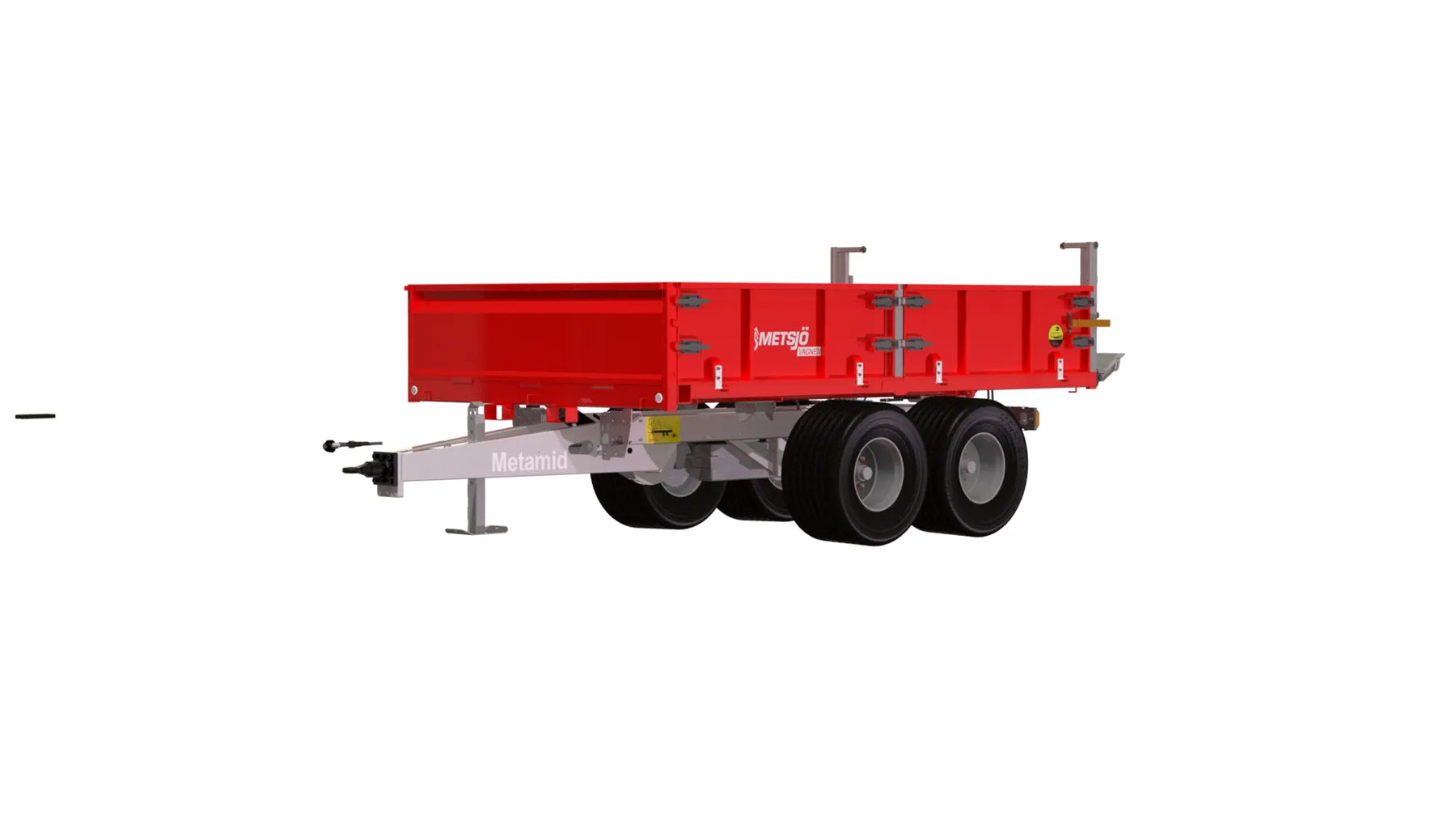 Artikelnummer chassi: 110132 Pendelboggi cc 1050 mm, Max belastning 6 ton/axel Avstånd över navflänsar 1850 mm. Ytbehandlas enligt KTL- metoden, svart Anslutning 161 x 205 x 6 mutter öppen Bromsar: hydrauliska på alla hjul - enligt VVFS 2003: 20, 5 Kap. 12 § Manuellt justerbara bromsarmar Max 110 bar hydraultryck. Skyddsplåt förhindrar smuts i trumma Baktipp. Tippvinkel: 55º. Oljevolym 10L /210 bar Belysning enligt TSV Diod 12/24 Volt 7 pol Fäste för tillval boggilift Fäste för valbart drag Färg Metsjö grå Förberett för valfri påbyggnad MetaMid/MetaNo Chassivikt 1550 kg, Teknisk belastning 15 000 kg Artikelnummer flak: 110234 Låglämsflak HD Mid/No L4165 H600 B2550 6,1kbm Slitplåt Brinell 450: Tjocklek Botten 6 mm, Syfte Grus Slitplåt Brinell 450: Tjocklek Framstam 3 mm Plåt Brinell 355: Tjocklek Sidor 3 mm Bakläm: Hydraulisk schaktläm höjd 300 mm, Hydraullås Sidläm fälls ned. Höjd 600 mm. Sektionslängd 2000 mm Gångjärnsbeslag 2 st, låsbeslag 4 st per sektion Framstam Höjd 600 mm Stabiliseringsstag mellan lämmar Bindningspunkter utsida 6st/sida Fäste för tillval spridarläm/band Fäste för tillval spannmålskitt Fästen för redskapsbytarben Lackas Metsjö Röd, karosseri kittas enligt Metsjö standard För Metamid / MetaNo chassi Vikt 1440 kg Vagns vikt 3070 kg, Nyttolast 11 930 kg Ytbehandling: Förbehandling med alkalisk avfettning och blästring Sa 2,5 Karosseri kittas. Lackerat enl. ISO 12944 A3.09. Färgsystem: Epoxiprimer 2 x 70 µm. Täckfärg: Polyuretan 1 x 60 µm totalskikt ca. 200µm. Korrosivitetklass C4 L Kringutrustning: Hydrauluttag bak 1/2 flöde. per/st, 106643 Hydrauluttag bak Broms (olja) serie koppling, 106642 Bultbart bakdrag + eluttag 7 pol, 105366 Topphängd spridarläm, 108921