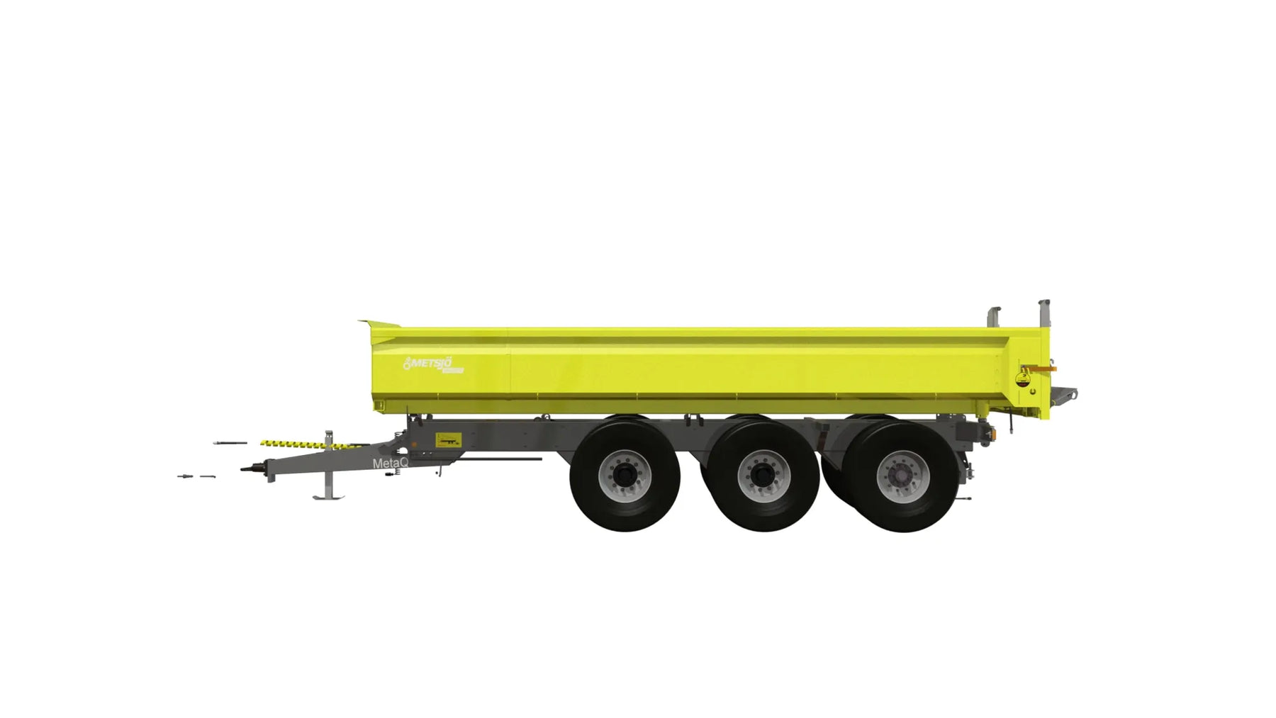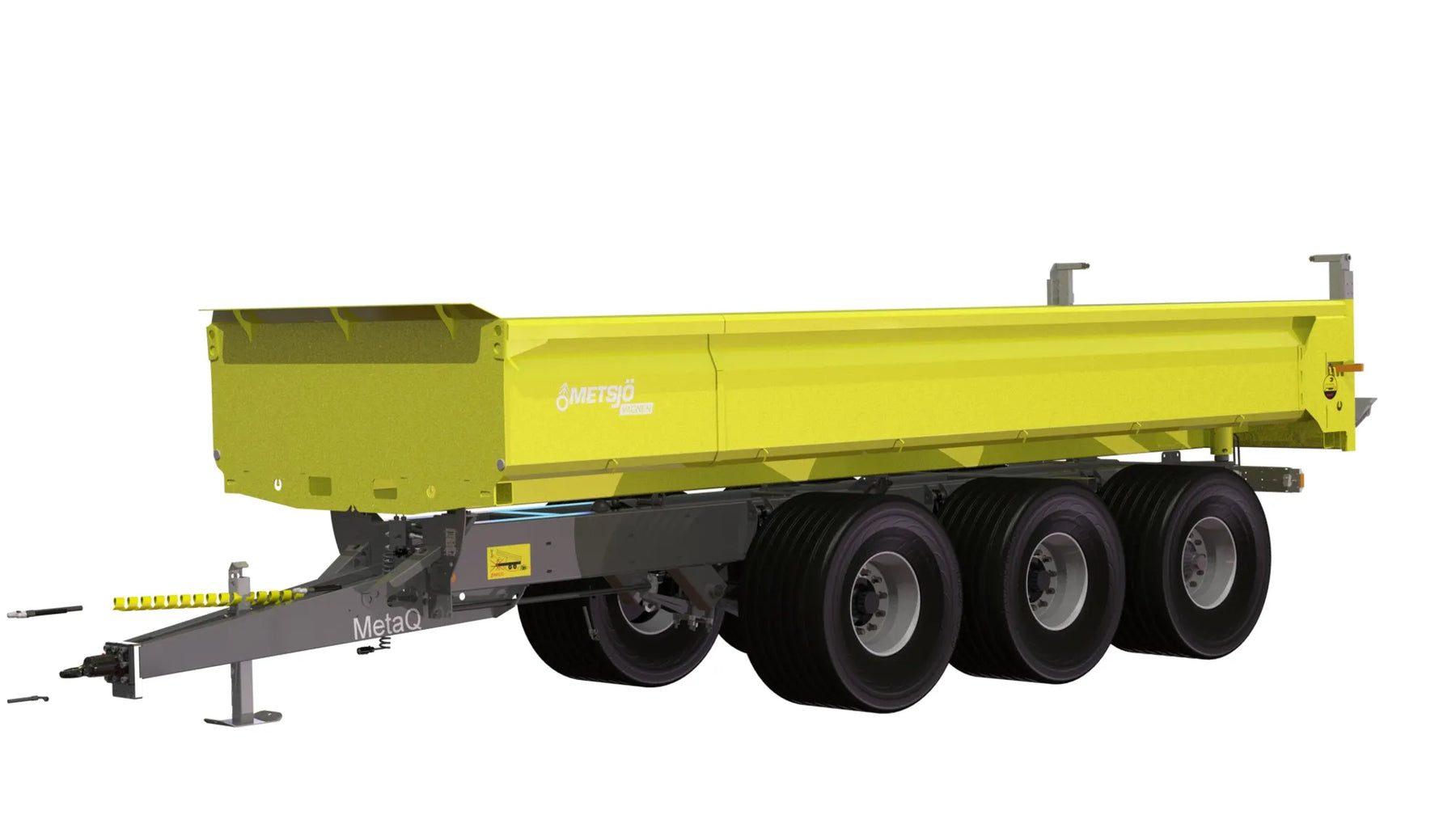 Paketerad maskin reducerat tillvalsutbud Artikelnummer chassi: 110188 Axlar: Hel axelkropp 120x120, Avstånd över navflänsar 2 000 mm Belastning 10,5 ton vid 62 km. Laserriktade. Ytbehandlade enligt KTL- metoden, svart Avstånd mellan boggiaxlar cc 1540 mm. Axelupphängning "Road" Medspårande axel med hydraulisk låsning vid backning (axel 3) Anslutning 280x335x10 kupolmutter Kommunicerande kärl: Hydrauliskt reglerbart chassi 350 mm vid chassit Bromsstorlek: 410x120. Hydrauliska bromsar på alla hjul - enligt VVFS 2003: 20, 5 Kap. 12 § Automatbromsarmar AGS. Max 110 bar hydraultryck. Skyddsplåt förhindrar smuts i trumma Baktipp. Tippvinkel: 52º. Oljevolym 45L/210 bar. Elsystem 12 Volt Belysning enligt TSV Diod 12/24 Volt 7 pol Automatlämsfäste Fäste för valbart drag Färg Metsjö grå Förberett för valfri påbyggnad MetaQ75 Chassivikt 4 300 kg Teknisk belastning: 34 500 kg Artikelnummer flak: 136024 Schaktflak MQ75 6.1 L7500 H800 B2550 14,6kbm 6.1 Övergång Sida/flak 3x30" Slitplåt Brinell 450: Tjocklek Botten 6 mm, Sida 6 mm, Syfte Grus Bakläm: Hydraulisk schaktläm höjd 300 mm, Hydraullås Bindningspunkter utsida / Surrningsdon invändigt Fäste för tillval spridarläm/band Fäste för tillval spannmålskitt Fästen för redskapsbytarben Lackas Metsjö Gul, karosseri kittas enligt Metsjö standard För MetaQ 75 / Olympia 75 chassi Vikt 2490 kg Vagns vikt 6790 kg, Nyttolast 27 710 kg Ytbehandling: Förbehandling med alkalisk avfettning och blästring Sa 2,5 Karosseri kittas. Lackerat enl. ISO 12944 A3.09. Färgsystem: Epoxiprimer 2 x 70 µm. Täckfärg: Polyuretan 1 x 60 µm totalskikt ca. 200µm. Korrosivitetklass C4 L Kringutrustning: Hydrauluttag bak 1/2 flöde. per/st, 106643 x 2st. Hydrauluttag bak Broms (olja) serie koppling, 106642 Bultbart bakdrag + eluttag 7 pol, 105366 Kombihängdspridarläm, 108724 Indikeringsslang schaktläm, 143951